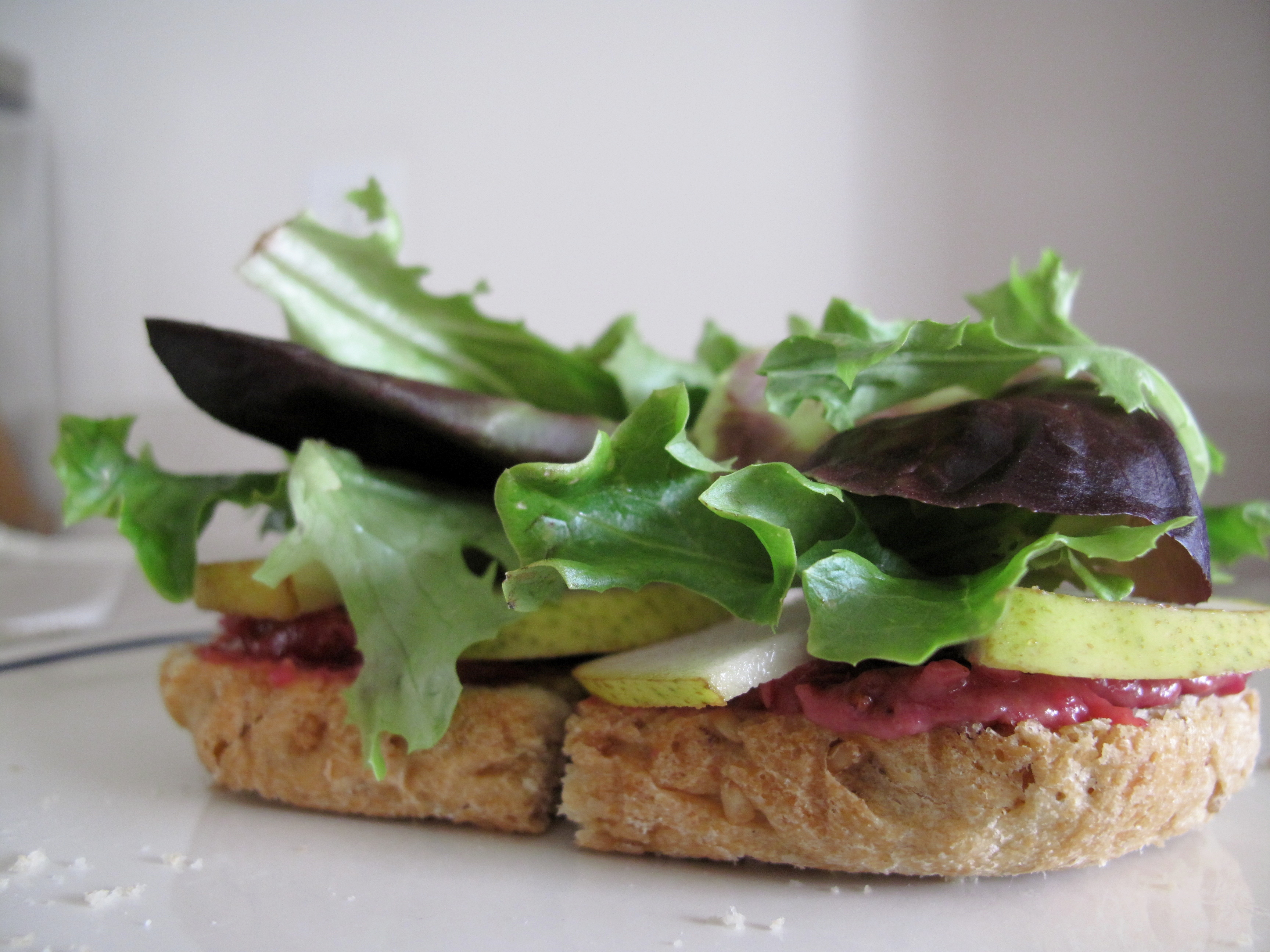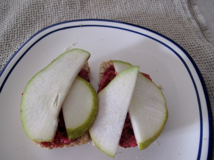 Cranberry-Pear-Peanut Butter Sandwich 2 slices bread of choice 2 tbs. creamy honey-nut peanut butter 2 tbs. cranberry sauce 1 tsp. whole-grain mustard 1/2 pear, thinly sliced Handful salad greens of choice Mix peanut butter, mustard, and cranberry sauce together. Spread on both slices of bread. Lay thin slices pear over cranberry mix. Top with salad greens and remaining slice of bread. Enjoy!