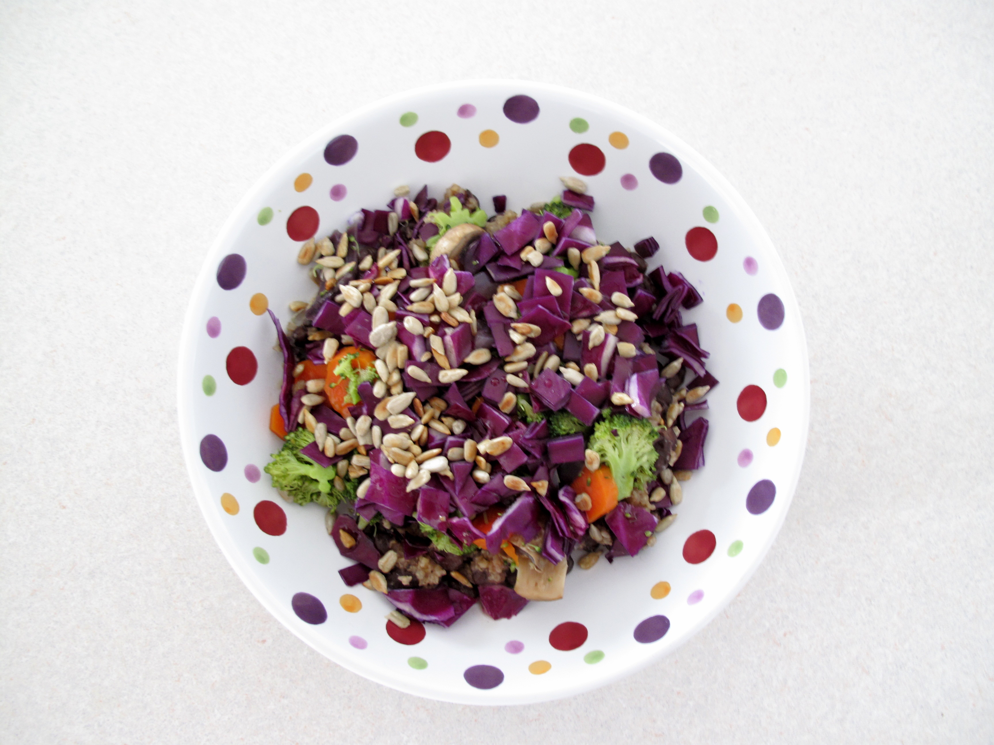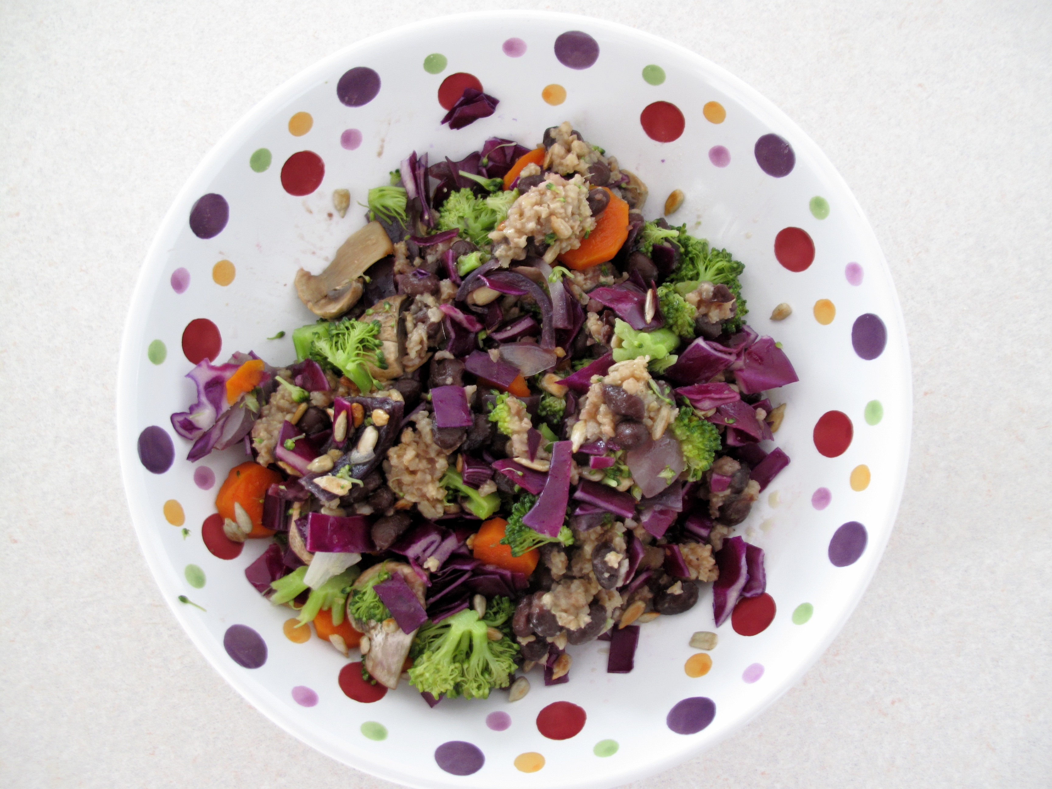 Black Bean & Vegetable Grain Bowl (adapted from Whole Living) Millet: 1/4 cup millet 1 15-oz. can black beans, rinsed 2 Tbs. minced fresh ginger pinch of salt 1 cup water Vegetables: 2 oz. mushrooms, sliced thickly 1/4 large onion 1 medium carrot, peeled and sliced into rounds 1 small bunch broccoli 1/2 cup shredded red cabbage Freshly ground black pepper 2 Tbs. toasted sunflower seeds Dressing: 1 tsp. sesame oil 1 tsp. rice vinegar Place millet, black beans, and ginger in a small saucepan. Add 1/2 tsp. salt to water. Bring to a boil, stir once, then reduce heat and simmer, covered for 25 minutes. Allow to rest for 10 minutes, and then fluff with a fork. Steam mushrooms, covered for 3 minutes. Add carrots, onions, and broccoli, and steam for 4 minutes more. Remove steamer from heat. In a small bowl, whisk together oil and vinegar. Season with salt and pepper to taste. Transfer millet and beans to bowl, spoon vegetables over grain, and garnish with remaining vegetables and seeds. Toss with dressing.