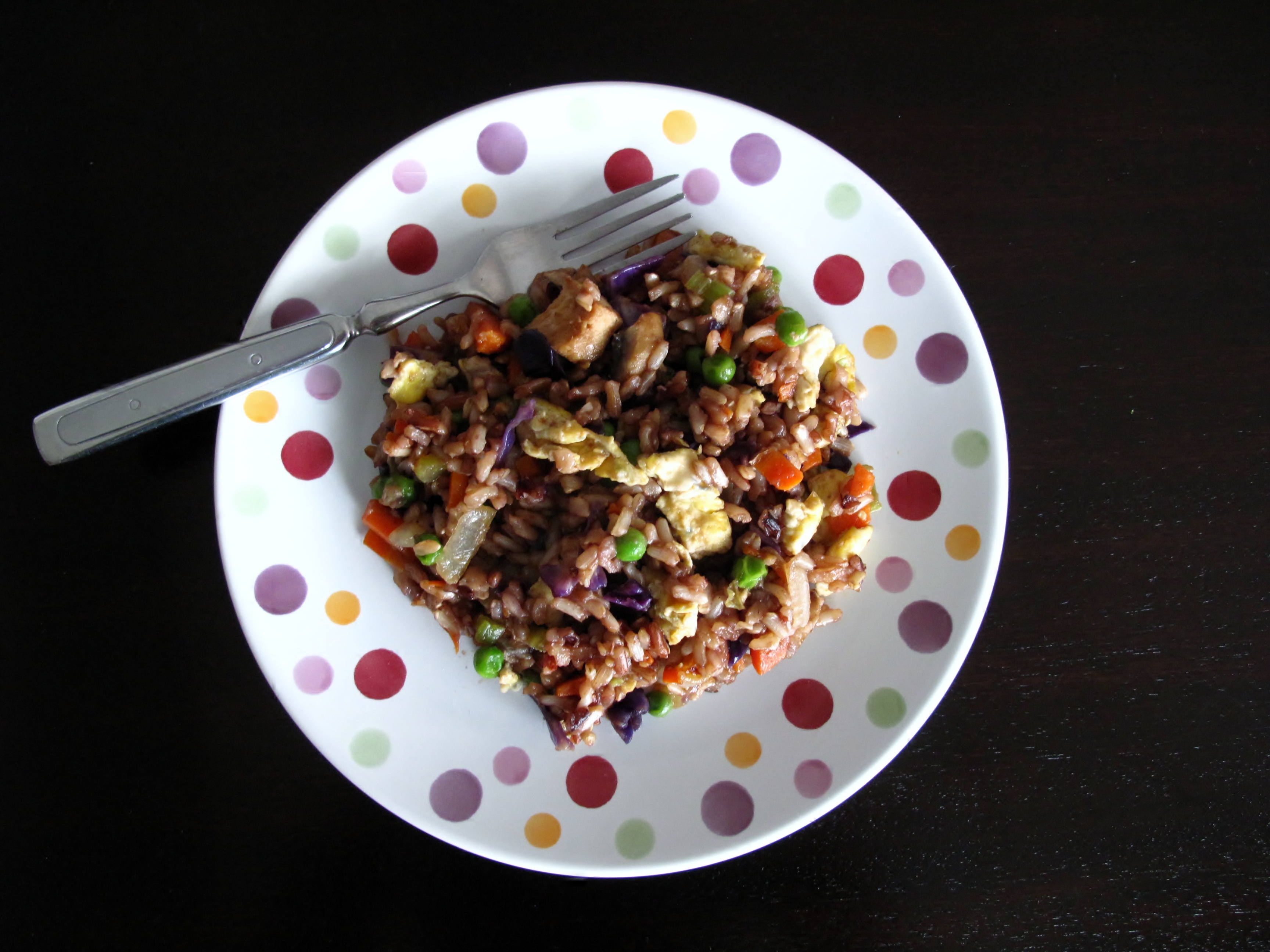1 cup rice, uncooked 1 Tbs. + 1 tsp. canola oil 2 eggs, beaten 1 tsp. ground ginger or 1 Tbs. grated, fresh ginger 1 large carrot, diced 1/4 onion, diced 1 celery stalk, diced 3 brown mushrooms, diced 3 medium cloves garlic, minced 1 cup green peas about 1 cup diced red cabbage 1 leftover pork loin chop, or similar amount of meat 2 to 3 Tbs. soy sauce freshly ground black pepper- Cook rice and set aside. (I used a brown rice mix but any type works fine).