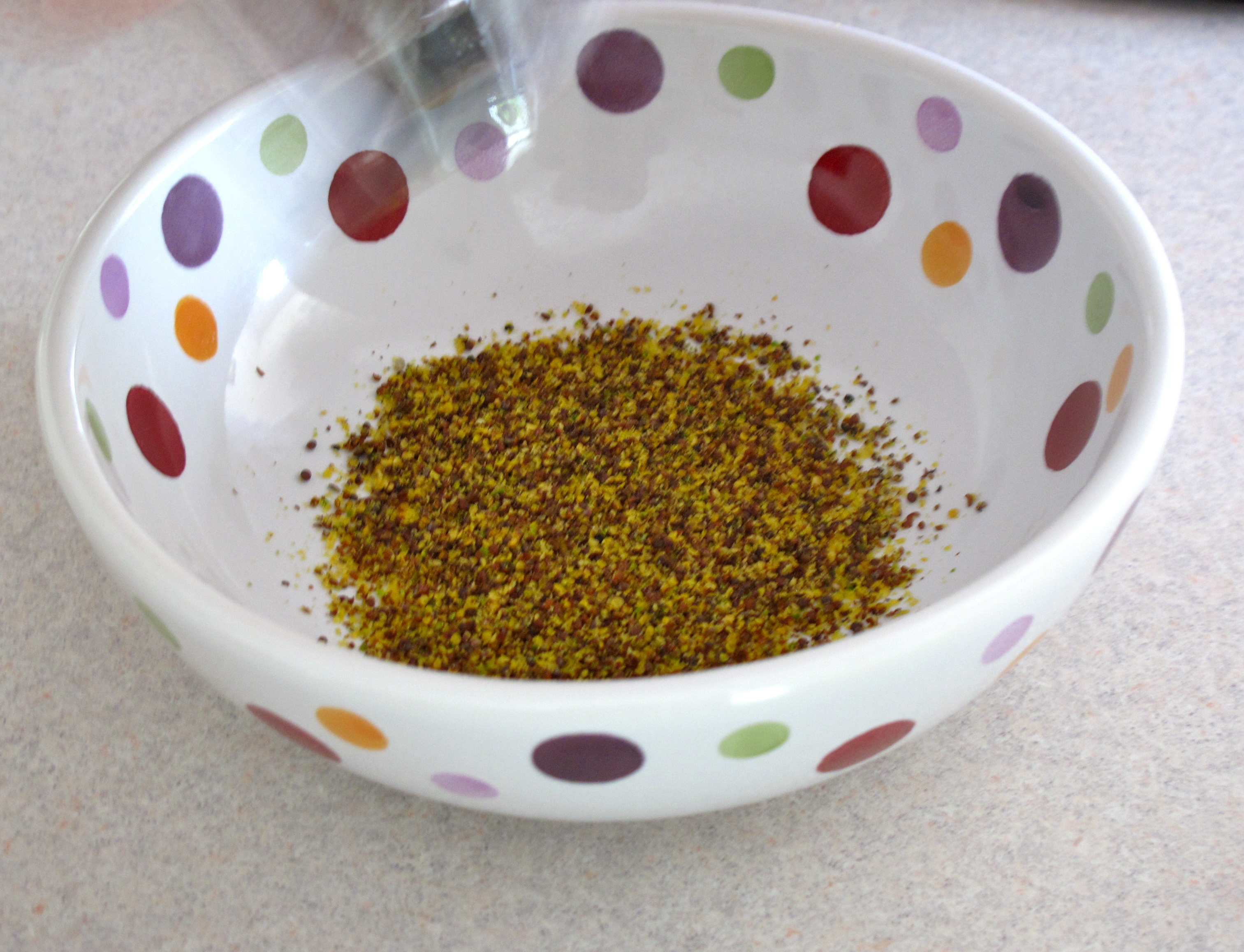 - When it is finished soaking, use a food processor to roughly grind the yellow seeds. Then grind the brown seeds into a fine powder using a spice mill, mortar and pestle, or as a last resort, a pepper mill. Mix the two mustards together with the remaining white wine vinegar, honey, and salt.