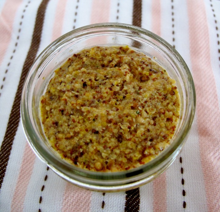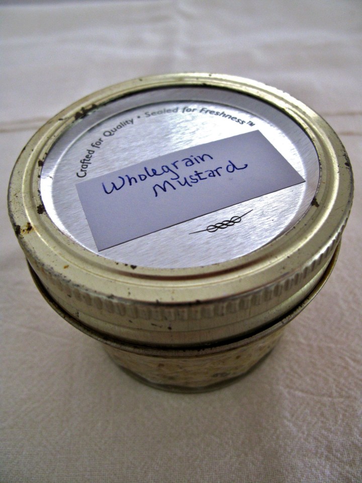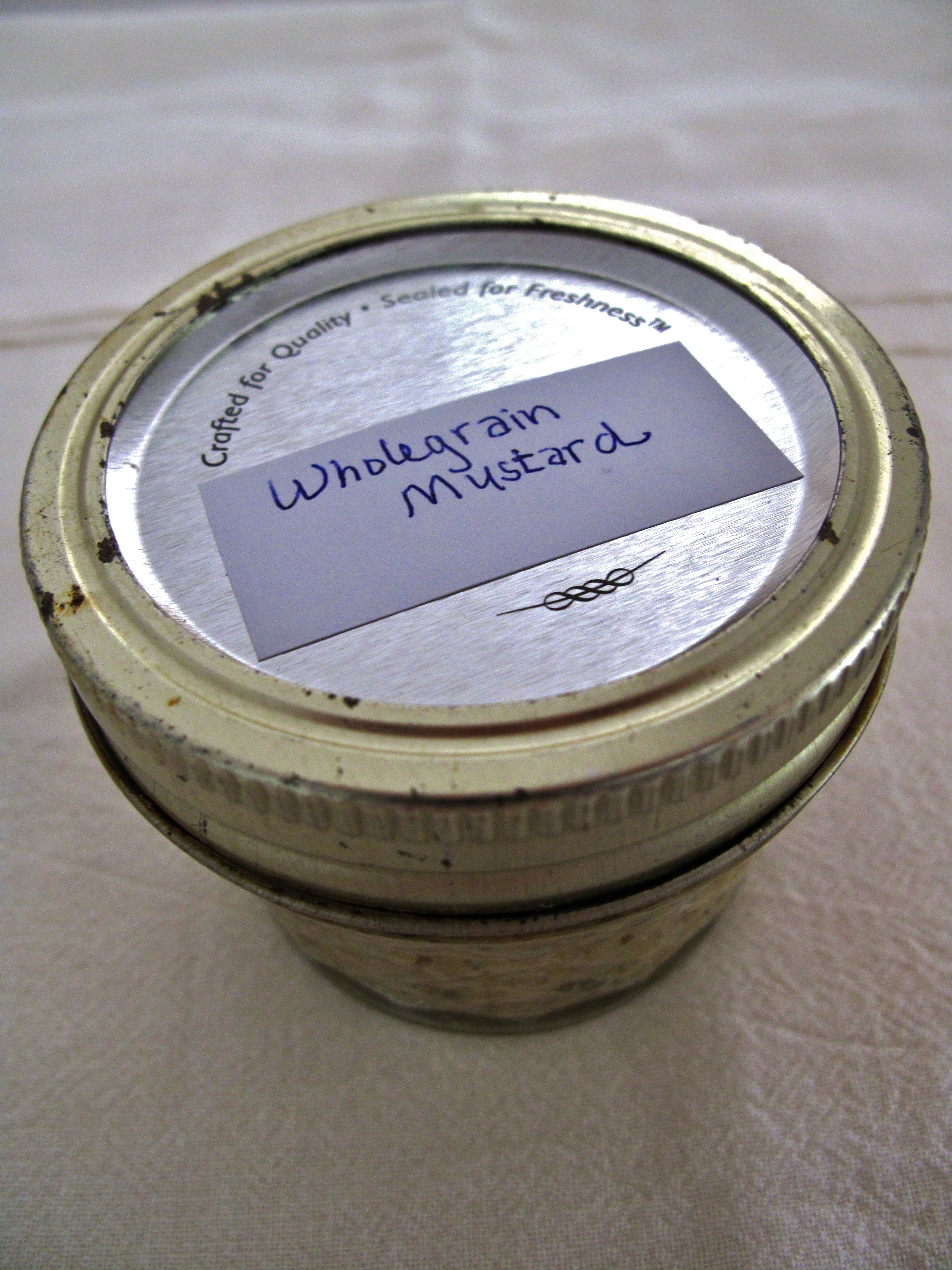 Wholegrain Mustard, adapted from Forgotten Skills of Cooking 1/3 cup white wine vinegar 3 Tbs. yellow mustard seeds 2 Tbs. brown mustard seeds 2 Tbs. white wine vinegar 1 Tbs. honey 1 tsp. salt- Pour the white wine vinegar over the yellow mustard seeds and leave to soak for 3-5 days. You may have to periodically add more vinegar so the seeds are covered. (The longer this sits, the hotter the mustard will be).