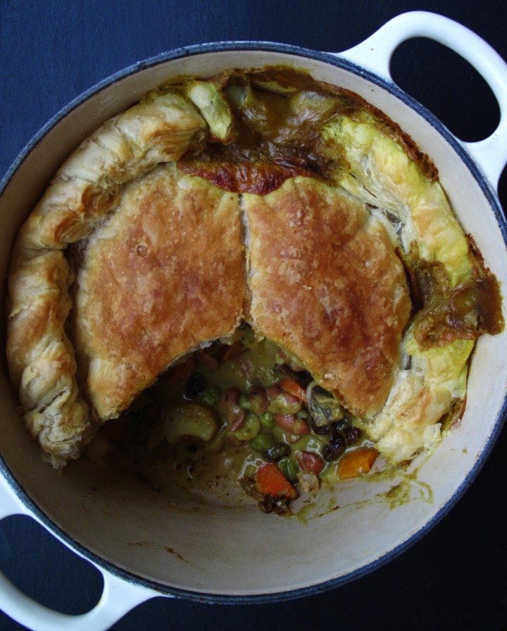 - Spoon mixture into a small 2-quart casserole and lay puff pastry over the top. Cut pastry and crimp to fit pan. Dash steam vents in top of pastry.