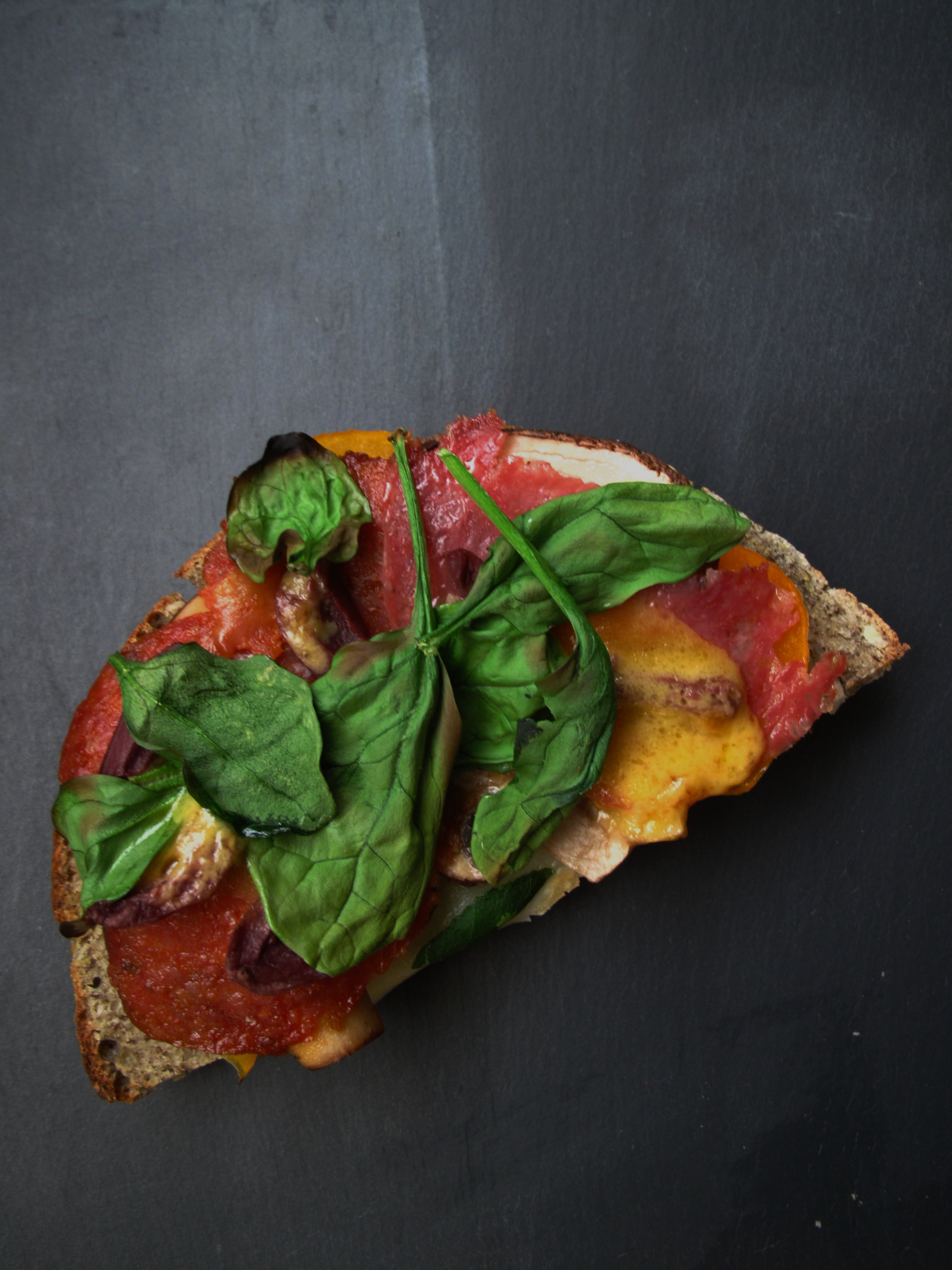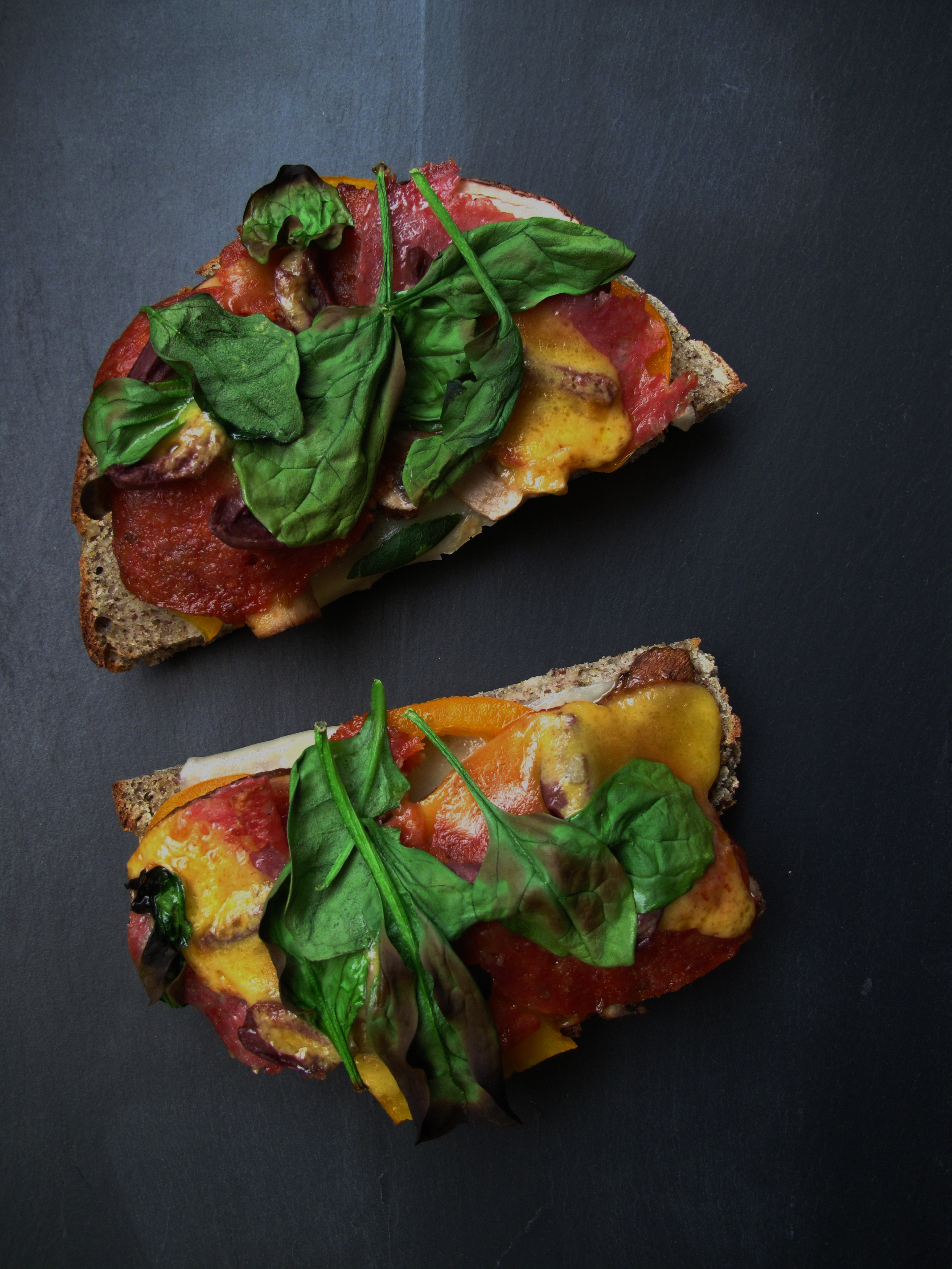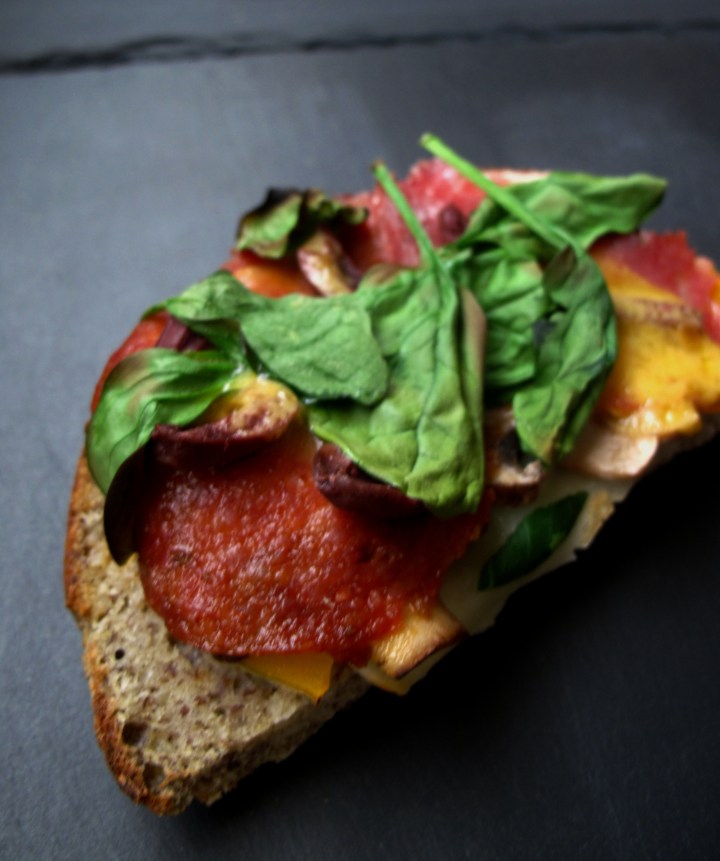 Cheesy Italian Charcuterie Sandwich good quality bread 3-4 thin slices good quality salami 3-4 thin slices good quality pepperone 1-2 thin slices medium or sharp cheddar cheese 1-2 thin slices good quality mozzarella cheese 4-5 kalamata olives, sliced 1-2 brown muchrooms, sliced Sliced yellow bell pepper handful fresh spinach leaves- Turn oven to broil.