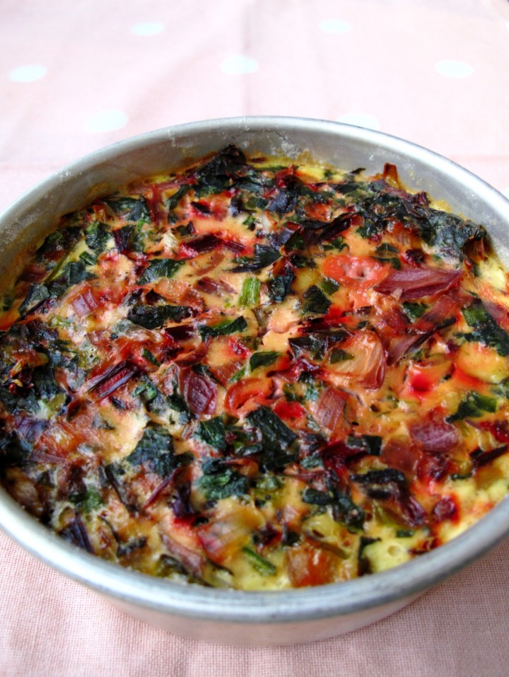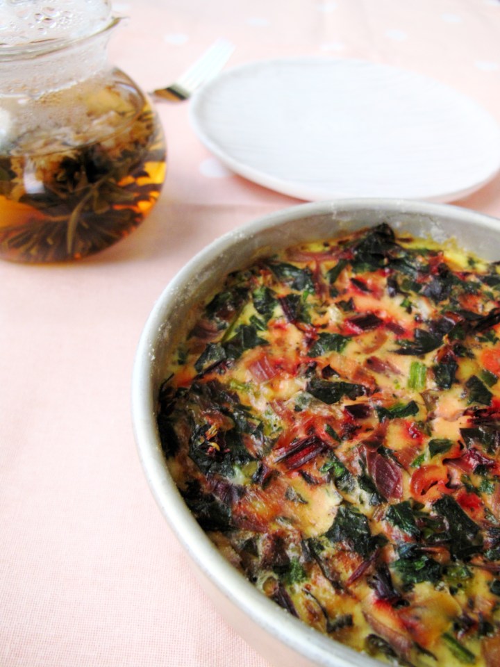 The trick, I think, is the crust. It’s incredibly unconventional, not at all like any other quiche I’ve ever found. And oh, so delicious. Half the greens go in the crust, you see. And it’s like magic happens in the oven. I think if I were really starving I could live on the crust alone and be happy.