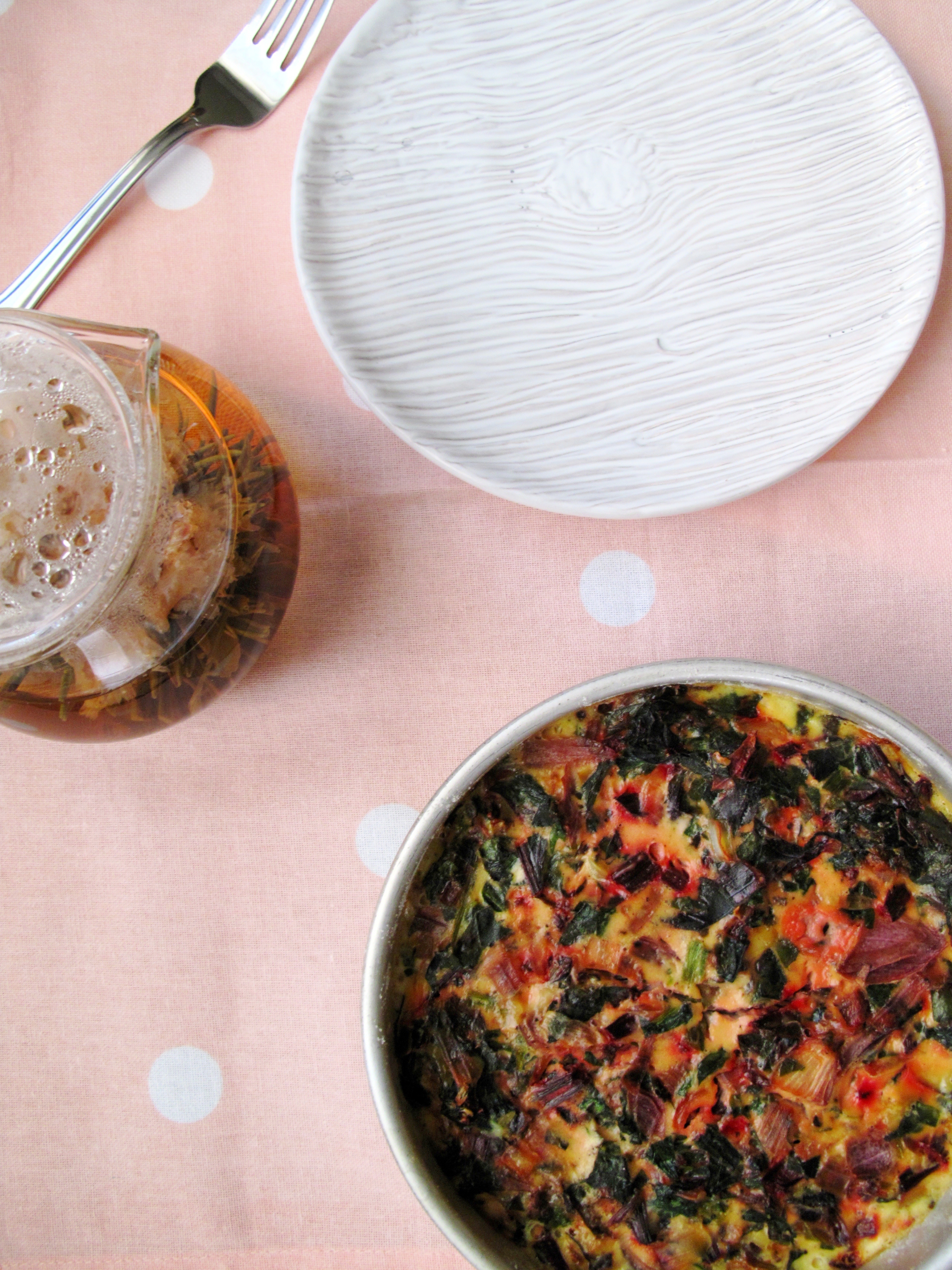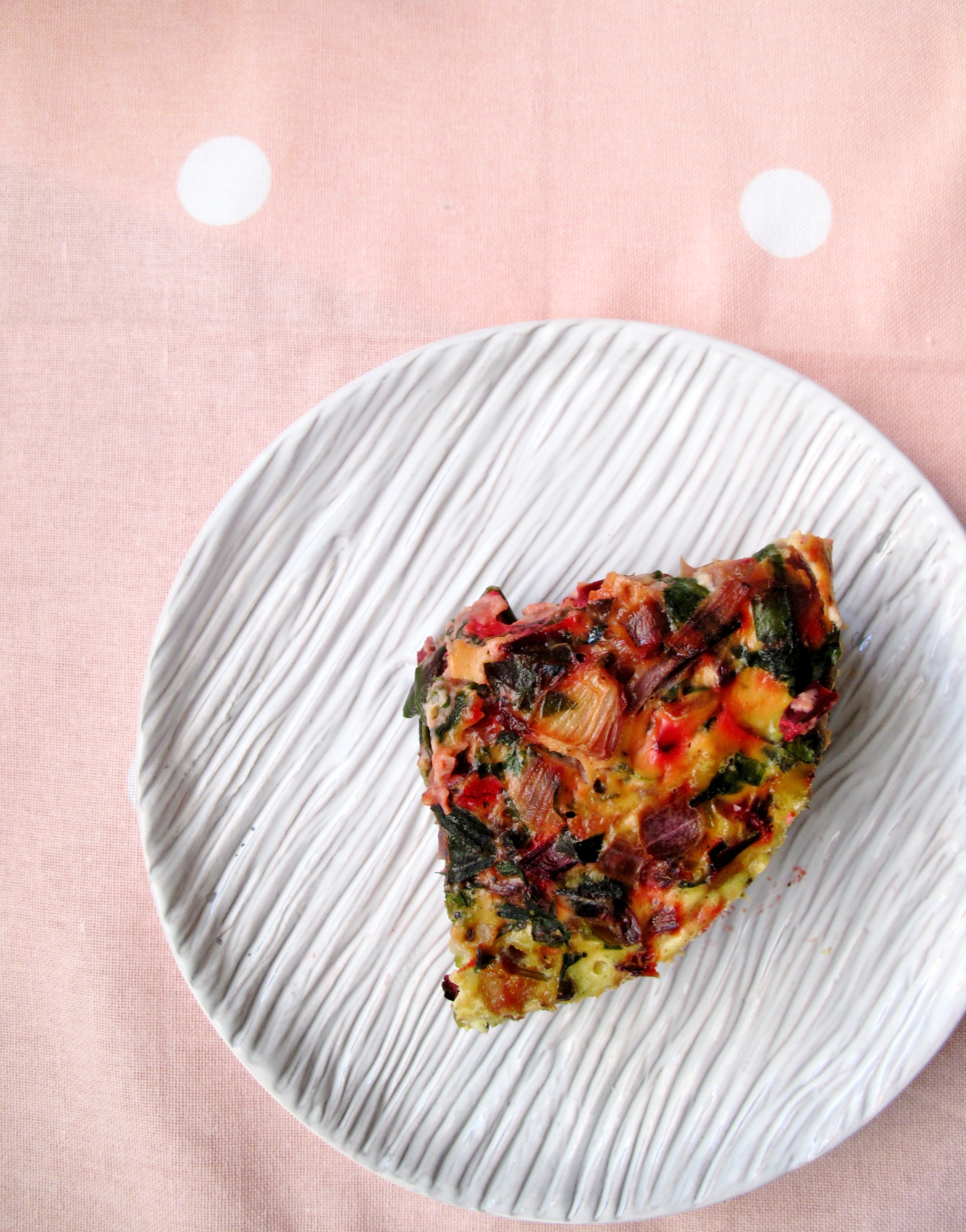 That’s what this quiche has done. It’s one of those decadent gone-wholesome things that somehow tastes better than either merely decadent or wholesome can on their respective own. I first tried this with chard, mushrooms, wheat germ, cheddar, and milk. Now it’s beet greens, flax seed, smoked gouda, and buttermilk. This is incredibly forgiving.