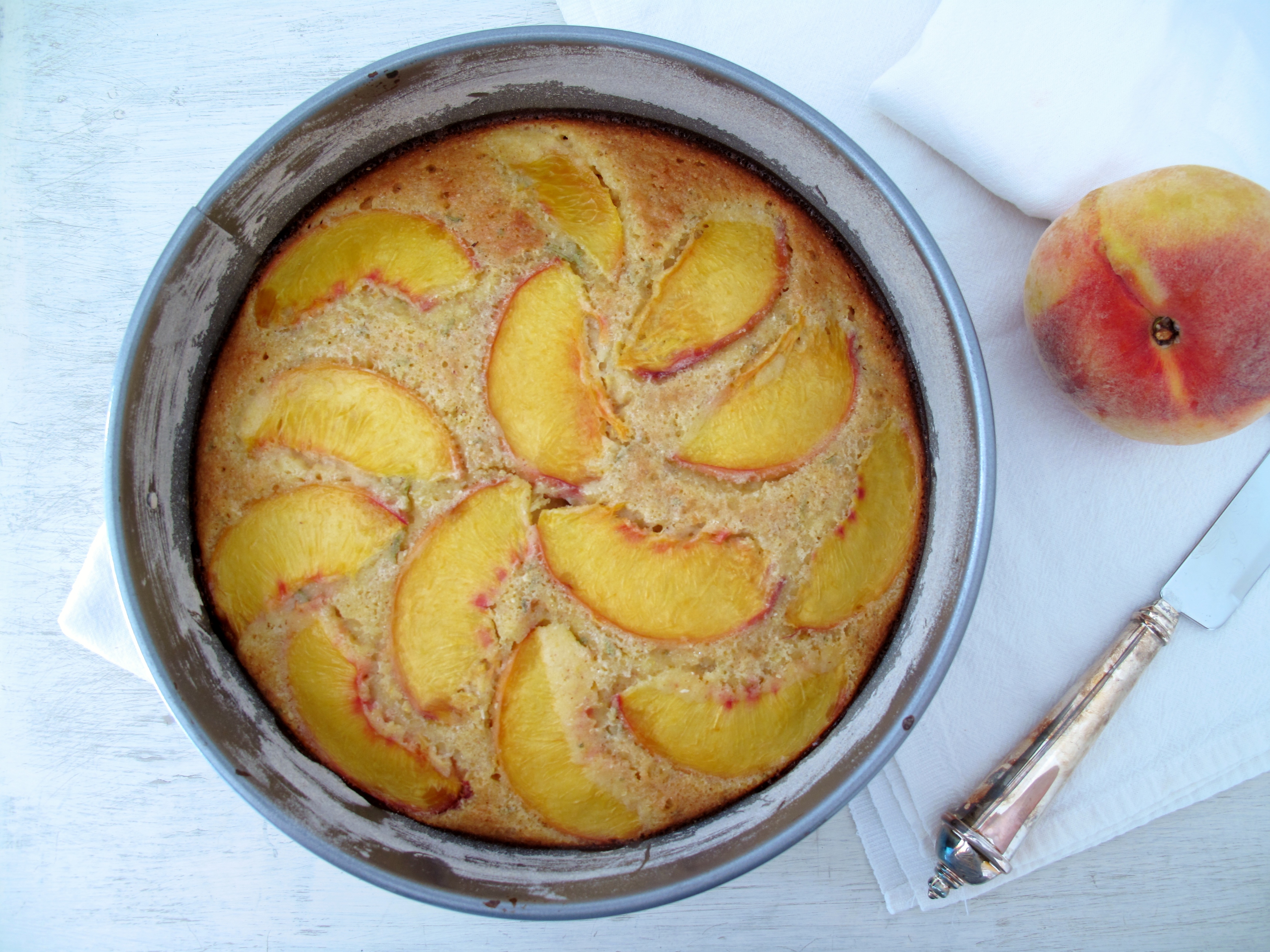 All of that has changed. To the second confession, I mean. I still have leftovers. I went to the farmers market yesterday and bought peaches from my favorite orchard. In a couple weeks, they will begin bringing in the first apples in all their glory. But right about now, Willamette Valley peaches are in their prime. Because I tasted each variety before purchasing, I finally chose the giant Red Globes that were perfectly sweet and ripe. Normally, I would simply slice them up one by one and eat, slowly, letting the juice drip. Drop. Onto the counter, all over my blouse, syrupy fingers infecting everything they touch. With the most perfectly ripe fruit, I wouldn’t usually want to mask its style by fussing. But I’ve been in need of a cake; something slightly savory with texture and herbs.