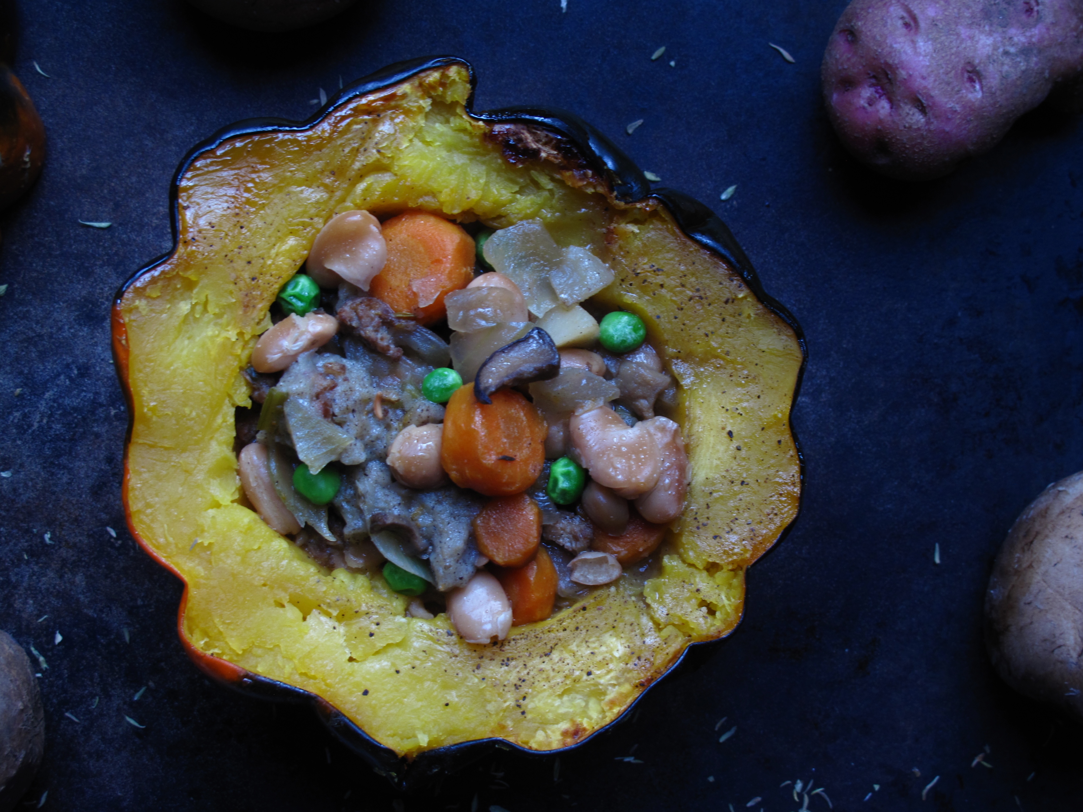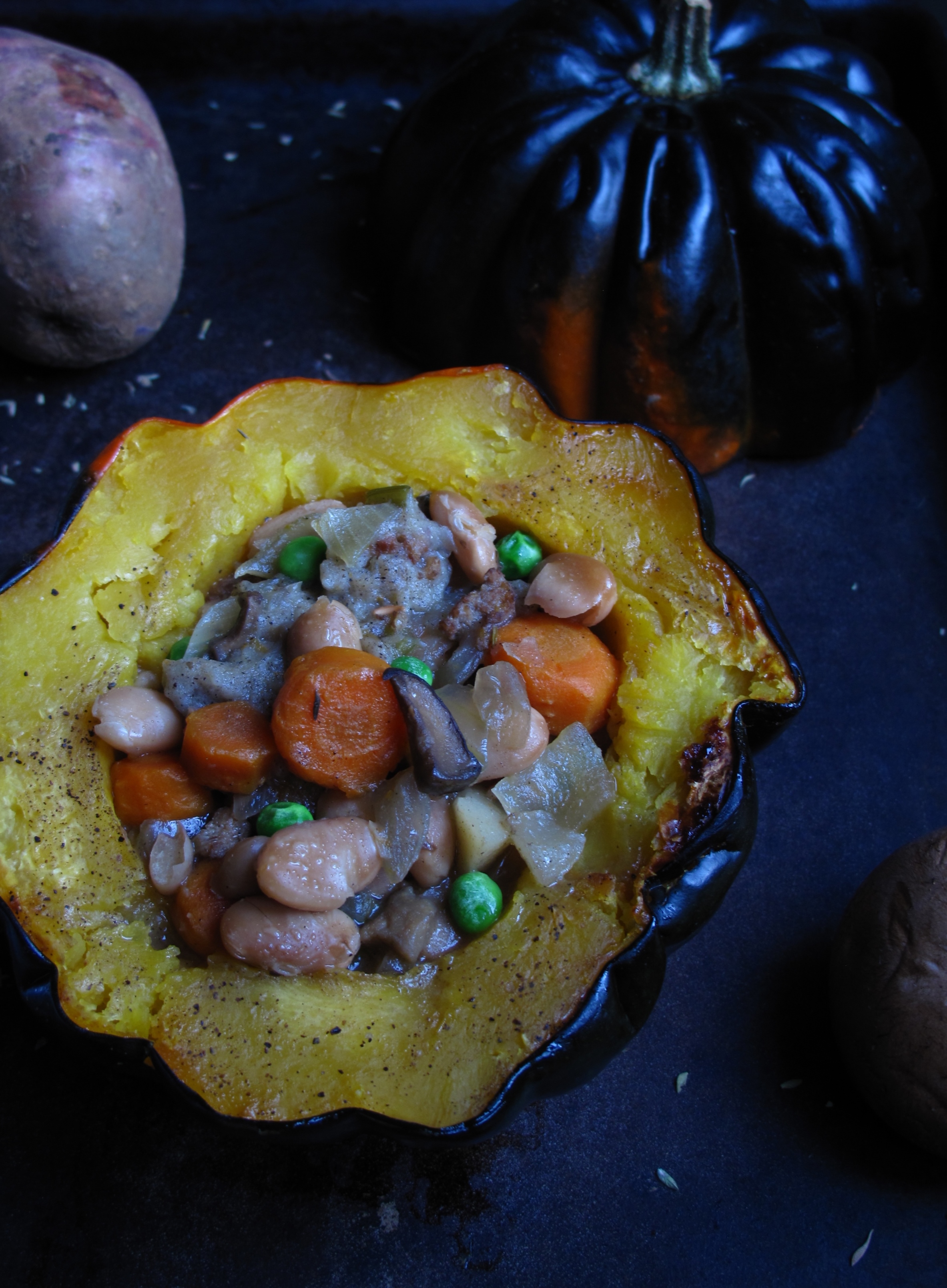 Autumn Bean and Sausage Acorn Squash Bowl Soup, adapted from The Martha Stewart Living Cookbook