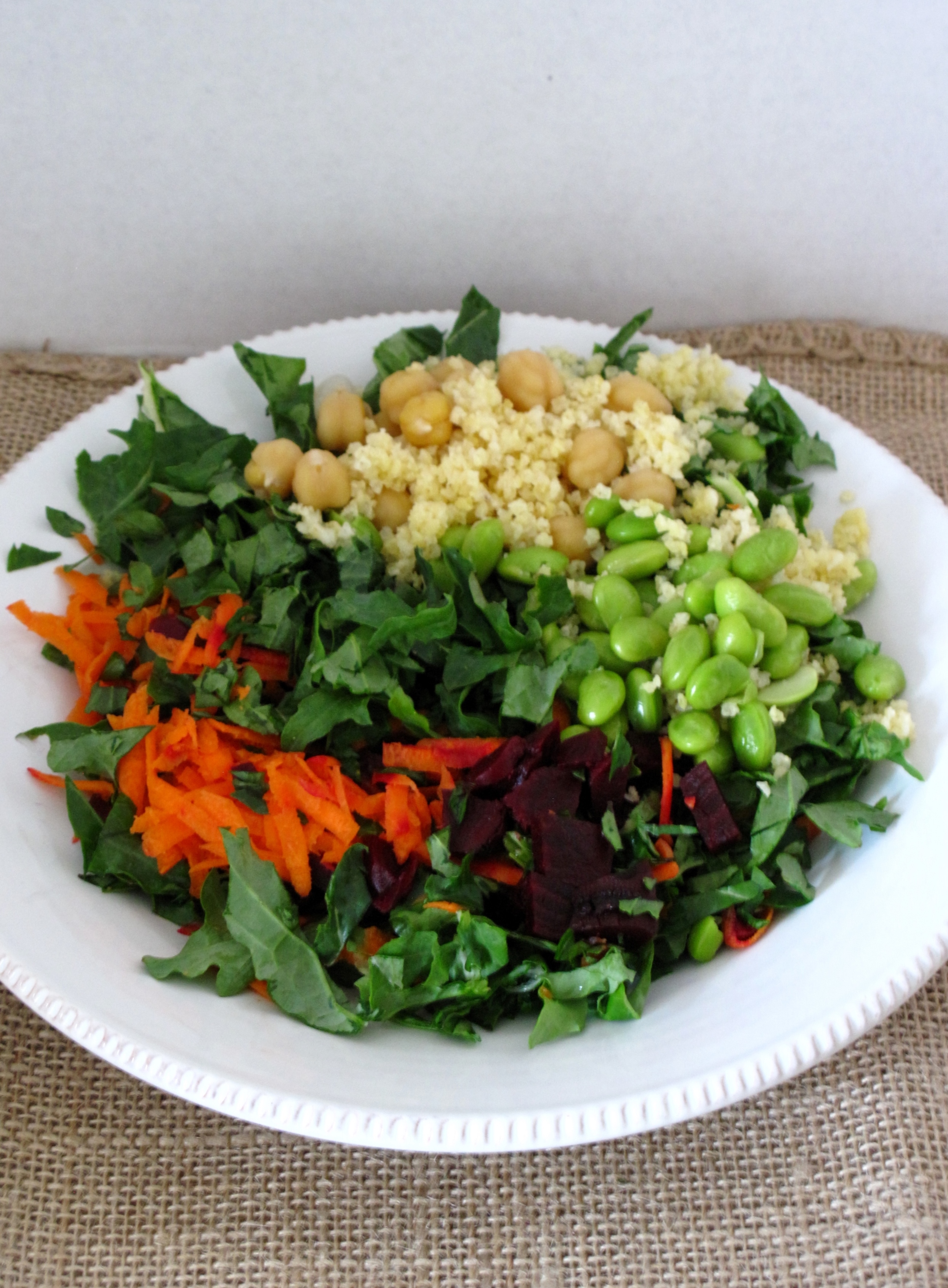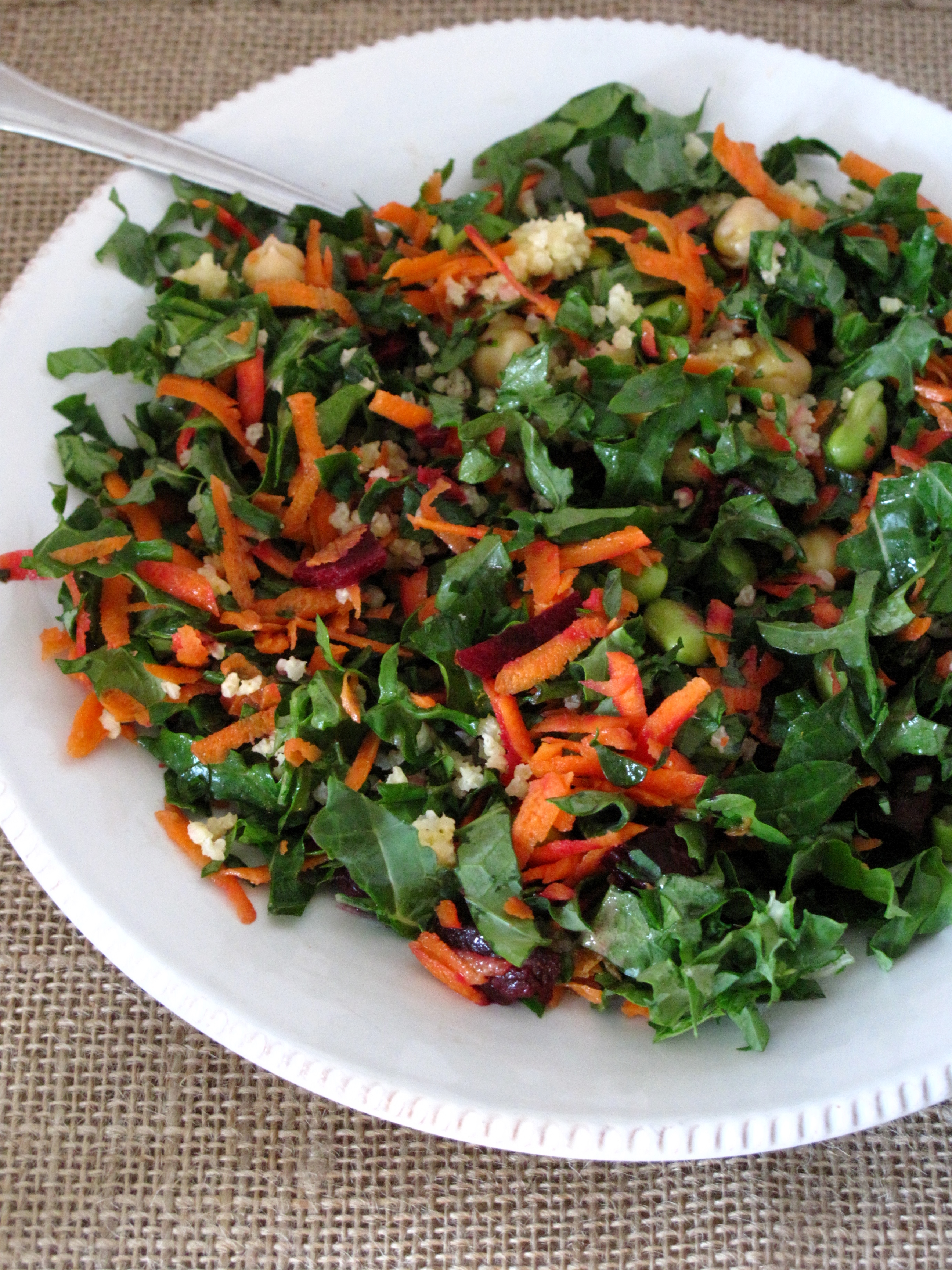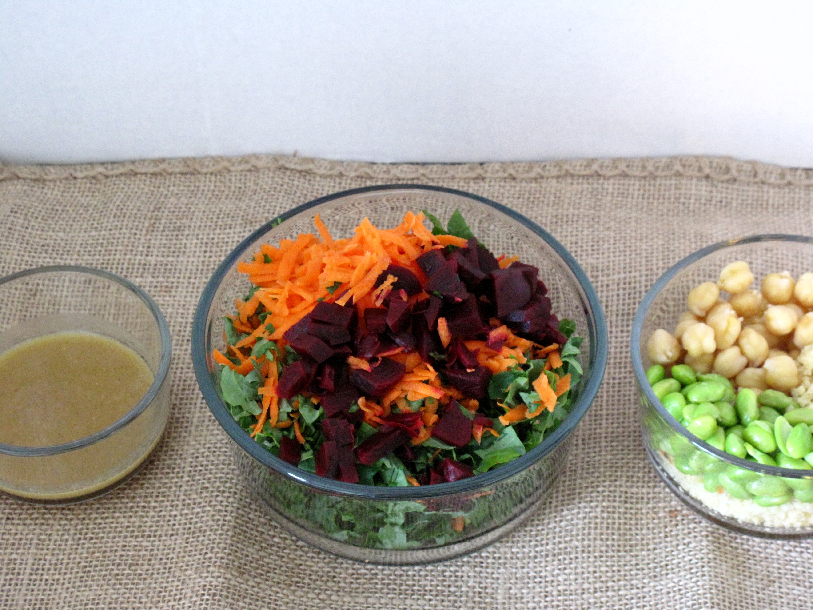 Kale Chopped Salad with Roots, Millet & Chickpeas, serves 3 Not only did we run in Victoria, but we ate. Amazing food. This salad was inspired by one I ate at Irish Times Pub in Bastion Square. Live music, a cozy nook, Bulmers Cider, and this salad were all I could ask of a good evening. Quinoa was in the pub salad, and can easily be subbed in for the millet. Among all the other ingredients, the flavor and texture comes out quite similar either way. 1 large bunch kale, destemmed and chopped 6 small beets, cooked, peeled and diced 3 large carrots, shredded 1 1/2 cups cooked millet or quinoa, warm 3/4 cup chickpeas, cooked and warm 3/4 cup edamame, gently steamed and warm 1 Tbs. dijon mustard 1 1/2 Tbs. honey 6 Tbs. extra virgin olive oil 3 Tbs. white wine vinegar Salt and pepper to taste- In a large bowl, toss chopped kale, diced beets and shredded carrots.