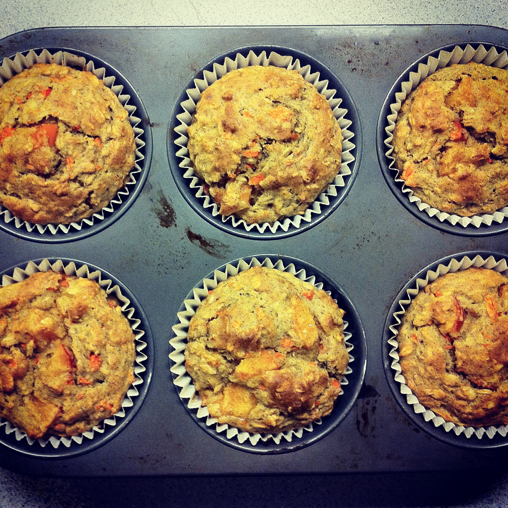 Apricot-Carrot Muffins, makes 6 large or 12 standard muffins This recipe is an update of one I posted a few years back. It is now gluten and dairy-free. Use the ripest apricots and the sweetest carrots that you can find–you will taste the difference. Feel free to use the original recipe if you have no dietary restrictions. 1 cup gluten-free flour 3/4 cup oats 1/4 cup oat flour 3/4 tsp. xanthan gum 1/2 cup brown sugar 1 large egg 1 cup diced fresh apricots 1 cup grated carrots 2 tsp. baking powder 1/2 tsp. salt 1 Tbs. canola oil 3/4 cup almond milk 1. Make oat flour by grinding 1/4 cup oats in a food processor until fine. 2. Bring together the flours, oats, baking powder, xanthan gum, salt and sugar in a large bowl. Make a well in the center and set aside. 3. In a separate bowl, whisk together the egg, oil, and milk. Pour into flour mixture. Give the bowl a couple of turns with a spoon and then stir in the carrots and apricots. Only stir until mixture is just incorporated. 4. Spoon evenly into muffin tins. 5. Bake in a preheated oven at 400 degrees F for approximately 20 minutes or until the tops are golden and the insides are set.