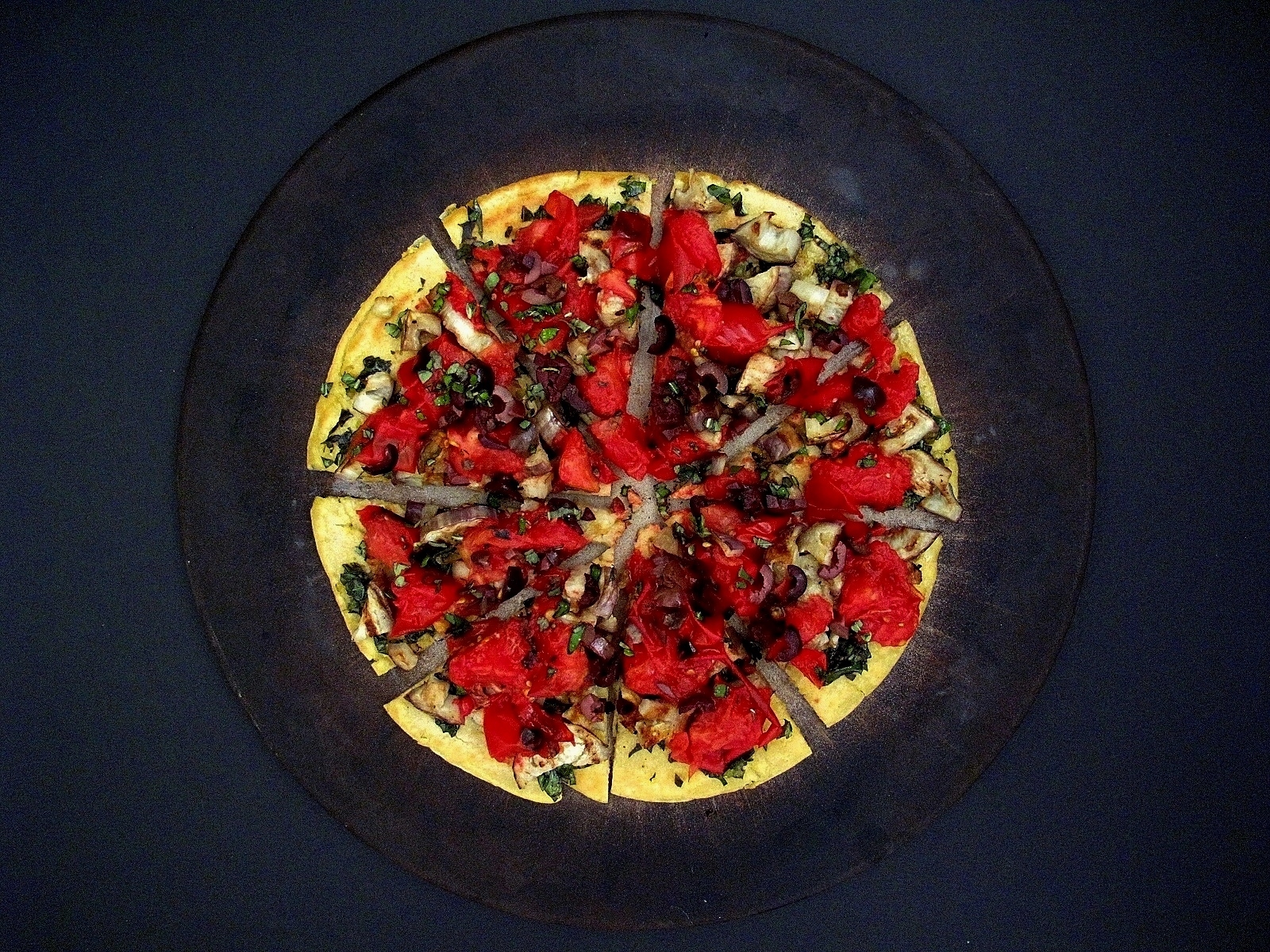 Summer Socca with Grilled Eggplant, Smashed Tomatoes, Olives + Basil, makes 2/serves 4