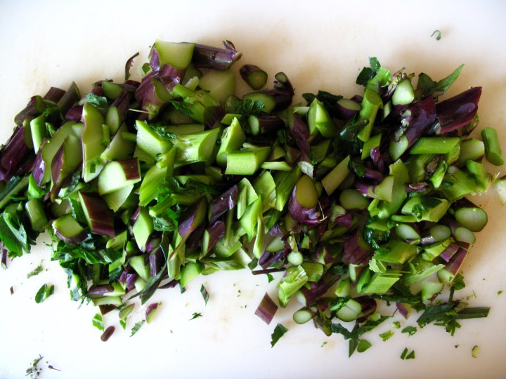 • Meanwhile, remove the longer stems from the raab and chop into 1-2-inch pieces. Slice the leaves and florets into longer 3-4 inch pieces and set aside.