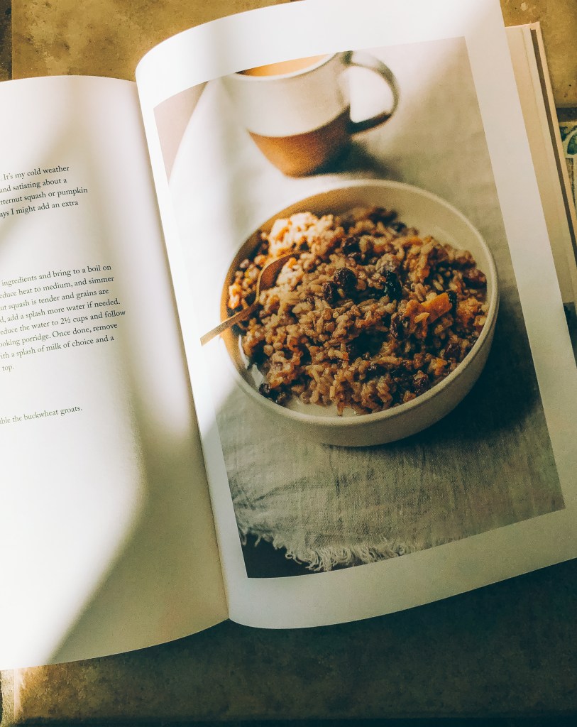 To be completely transparent in portion sizes, I make this recipe as a half batch for one meal. That is a perfect amount for me, as a very active person, to go several hours between breakfast and the midday meal with excellent energy and ‘fuel’. Claire’s suggestions include adding an extra spoonful of ghee for vata support on very dry and cold days, reducing the cinnamon slightly for high pitta (cinnamon in large amounts is quite heating so good for some with high vata and kapha, but less so for others), and taking out the oats and doubling the buckwheat for high kapha. For a completely vegan and/or dairy-free version, I suggest using untoasted sesame oil, especially for vata/kapha, or coconut oil instead.