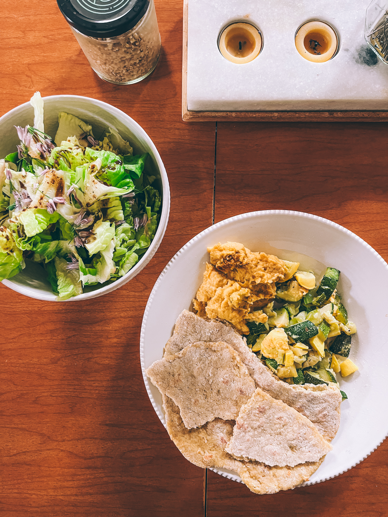 • This flatbread with roasted zucchini, hummus, and a crunchy, seedy salad.