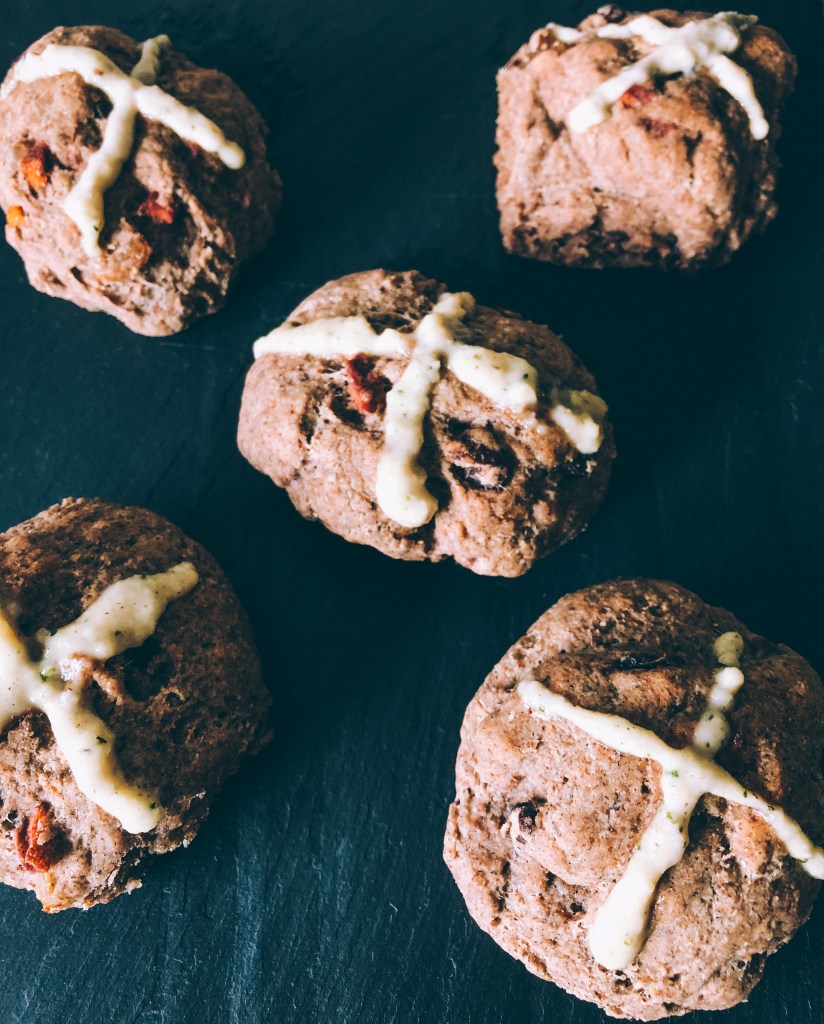 – There are a few ways to make the cross on top, either with a bit of icing after baking, by cutting a cross in the dough before baking, or by making a flour and water paste and drizzling it on top before baking. I meant to cut my dough before baking but then forgot, and decided to use a quick couple spoonfuls of cashew, vanilla and honey ‘frosting.’ I haven’t added that in here because I think it’s too fussy and these don’t need a sweet finish. They taste great on their own!