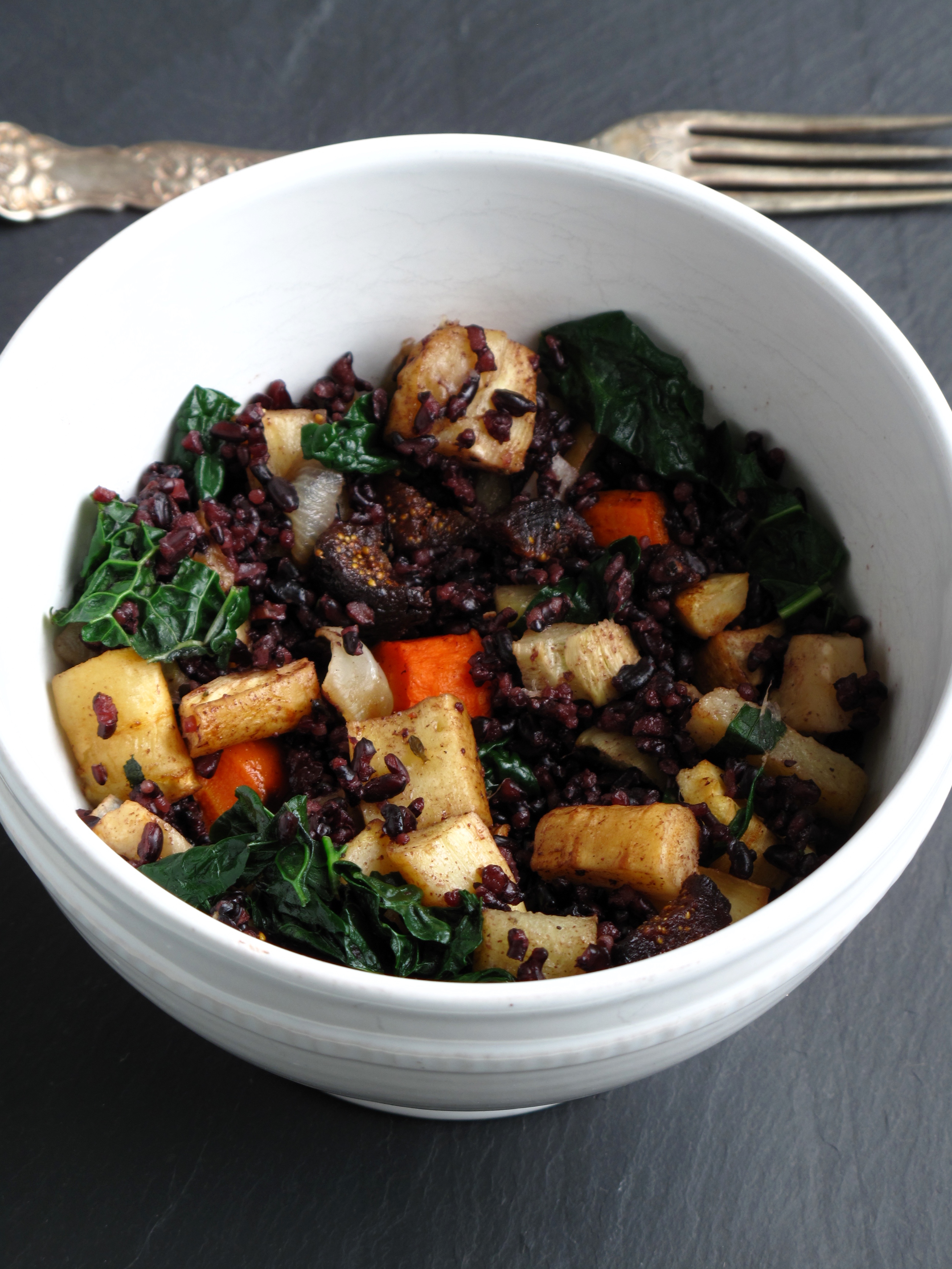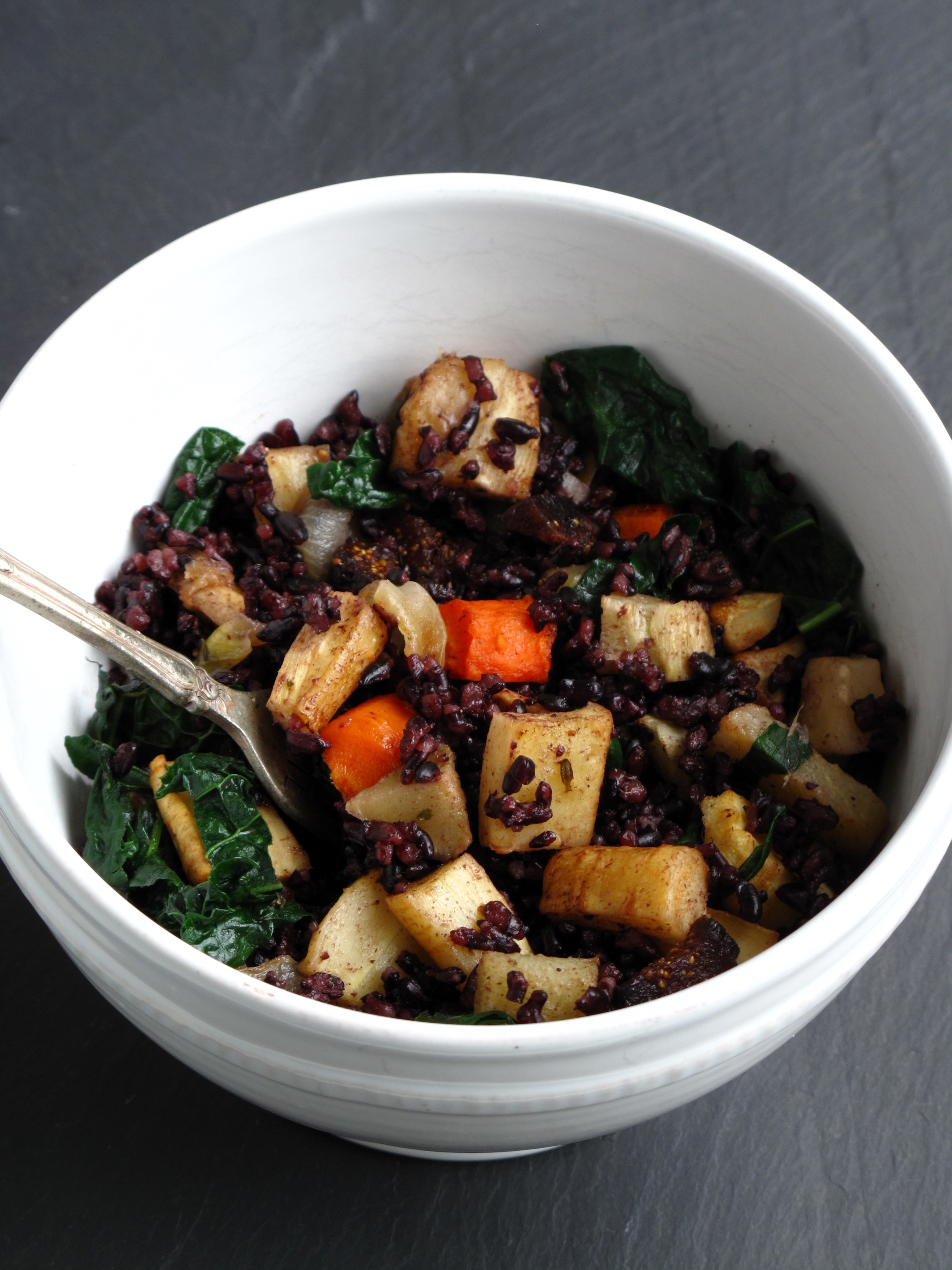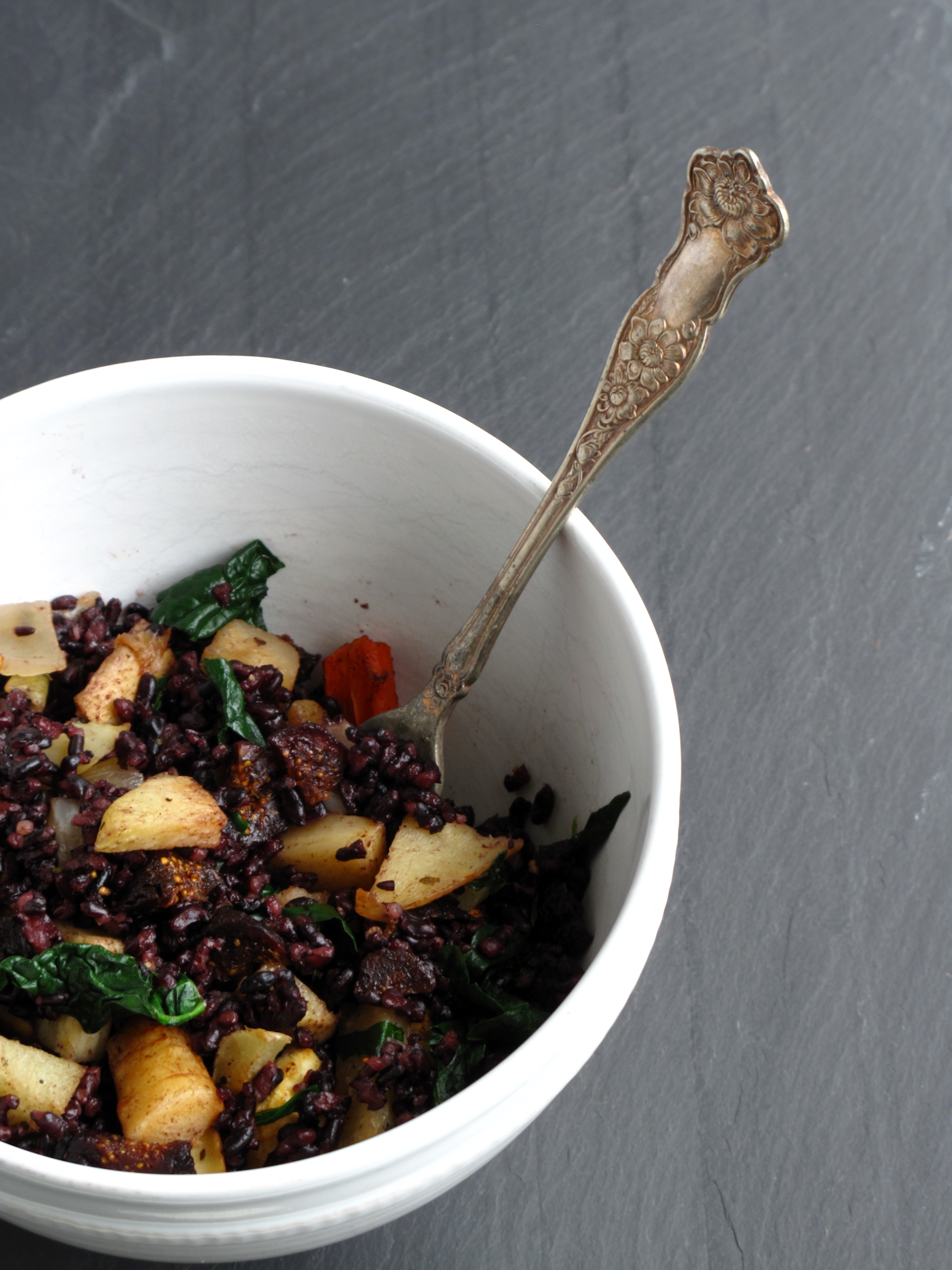 I spent half my childhood practically living at the home/nursery/farm of my two best friends down the road. Jari and Sheila, who I consider my second set of parents, gifted us the richest, grape-iest home-grown and pressed grape juice for Christmas. I’ve had gallons of it tucked away in the freezer for months, all the while trying to scheme up exactly the right way to make use of it. I boiled down a few cups into a thick, molasses-type concoction that is heavily infused with fresh ginger and rosemary. If you have an hour or so to mostly ignore a simmering pot, grab a bottle of grape juice and make syrup! It is simply the best with earthy black rice, white beans, and whatever greens are on hand this spring.