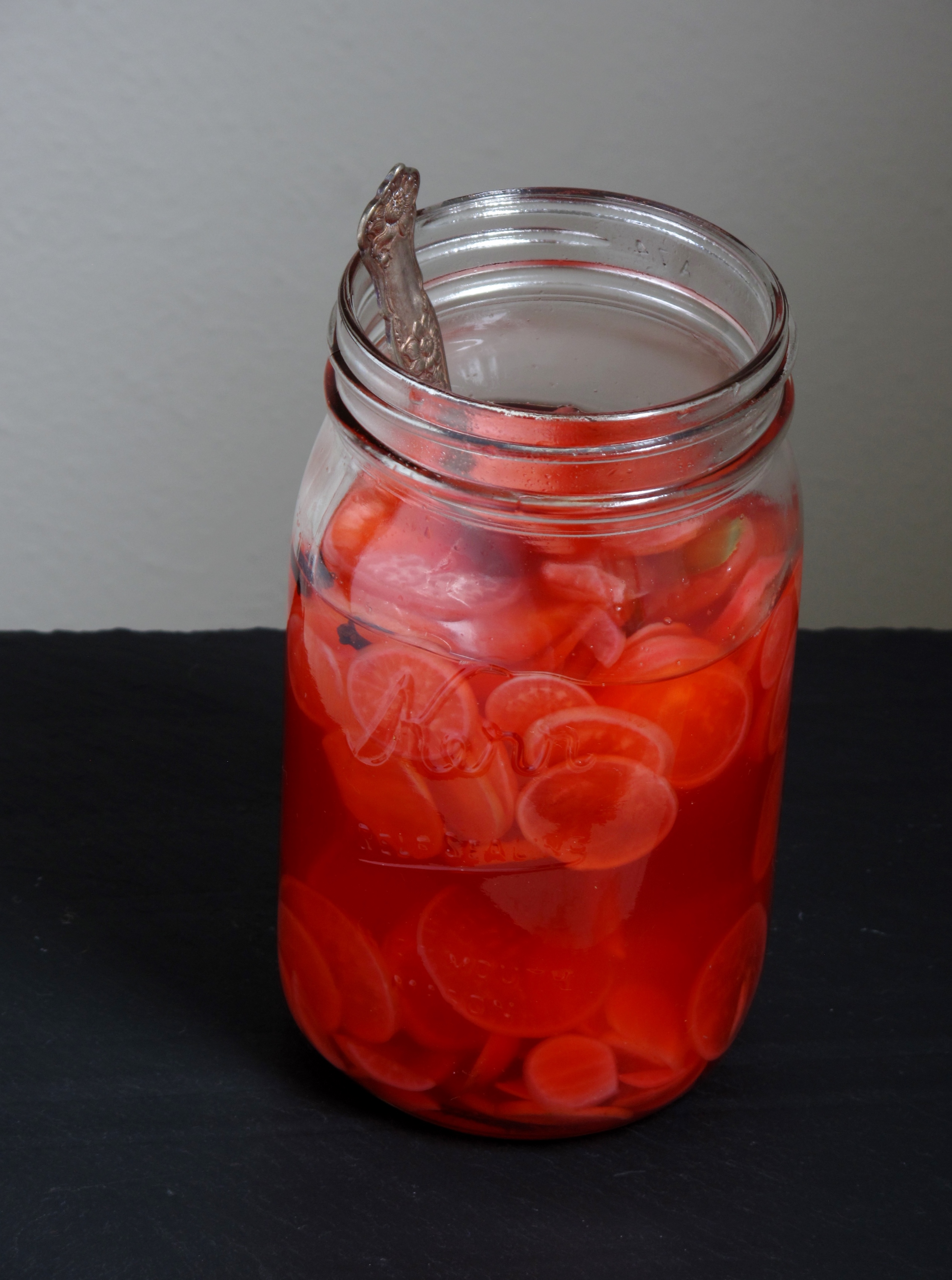The Recipe Redux challenged us to a DIY recipe this month and I’m especilly excited about these quick-pickles because William has gotten on board and he is was not a pickled-anything fan. They are super easy to make and can liven up almost any sort of dish (I’m making fava burgers next–you better believe these are going all up on them!) If you’ve got a few minutes, some sort of vegetable (of the root variety preferred) and vinegar, you’ve got yourself quick-pickles.
