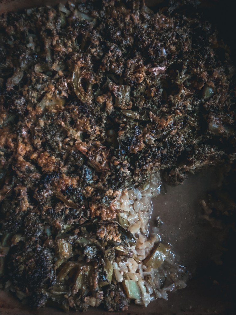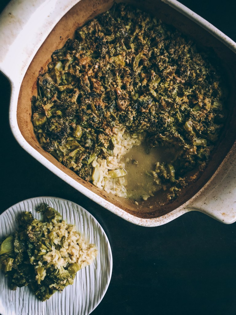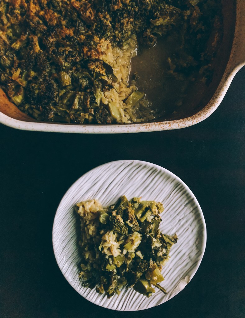 This is a far cry from, yet extremely reminiscent of the cheezy Broccoli Rice Casserole I grew up eating around the holidays. The combination of the spices, tahini and coconut milk seem like they’d yield a curry rice bake – but the result is actually far more subtle and more in line with the cheez whiz, instant rice, and cream of mushroom soup combination of childhood. It’s creamy, comforting, and a perfect addition to either a holiday or an everyday winter’s meal.