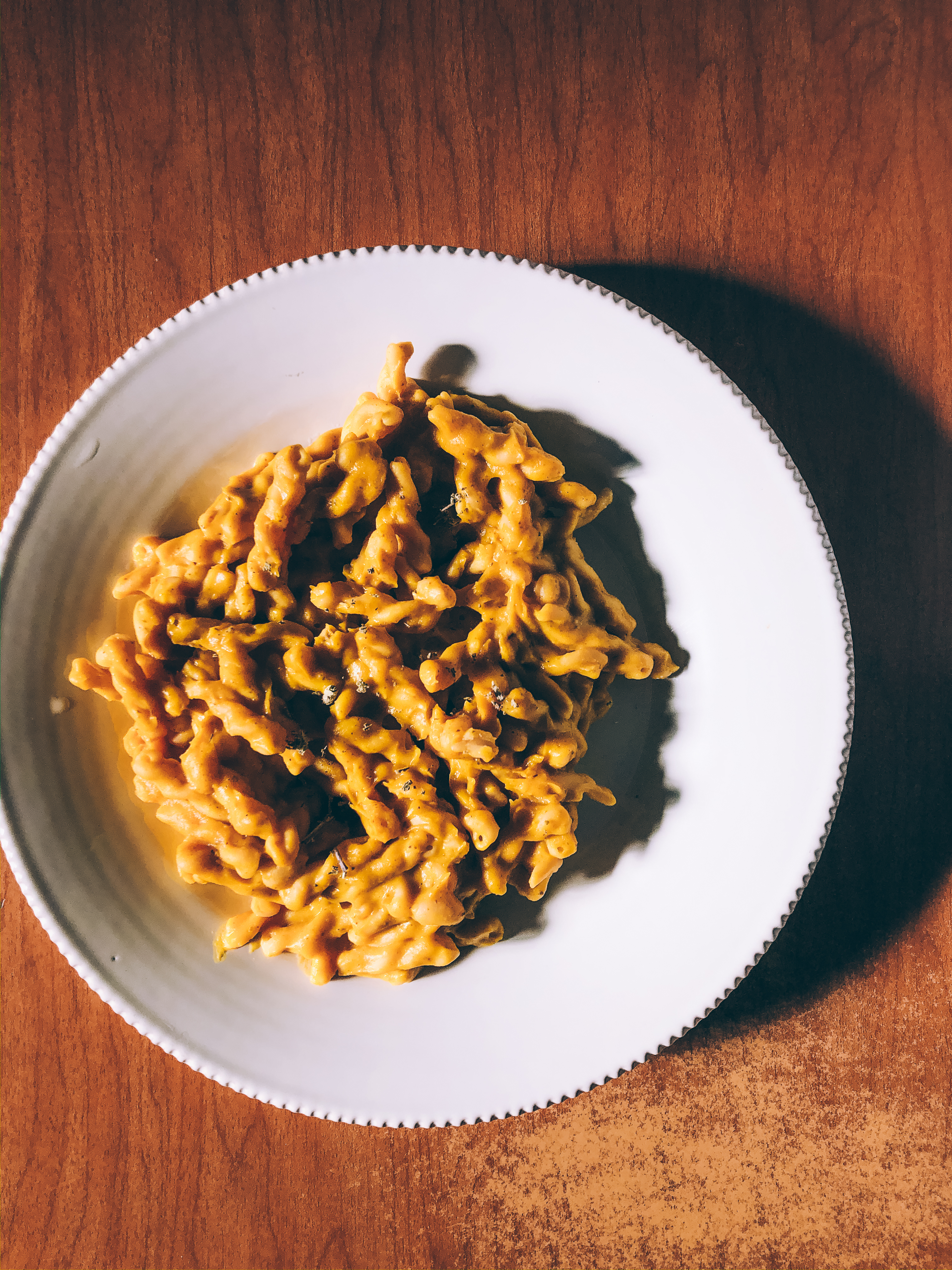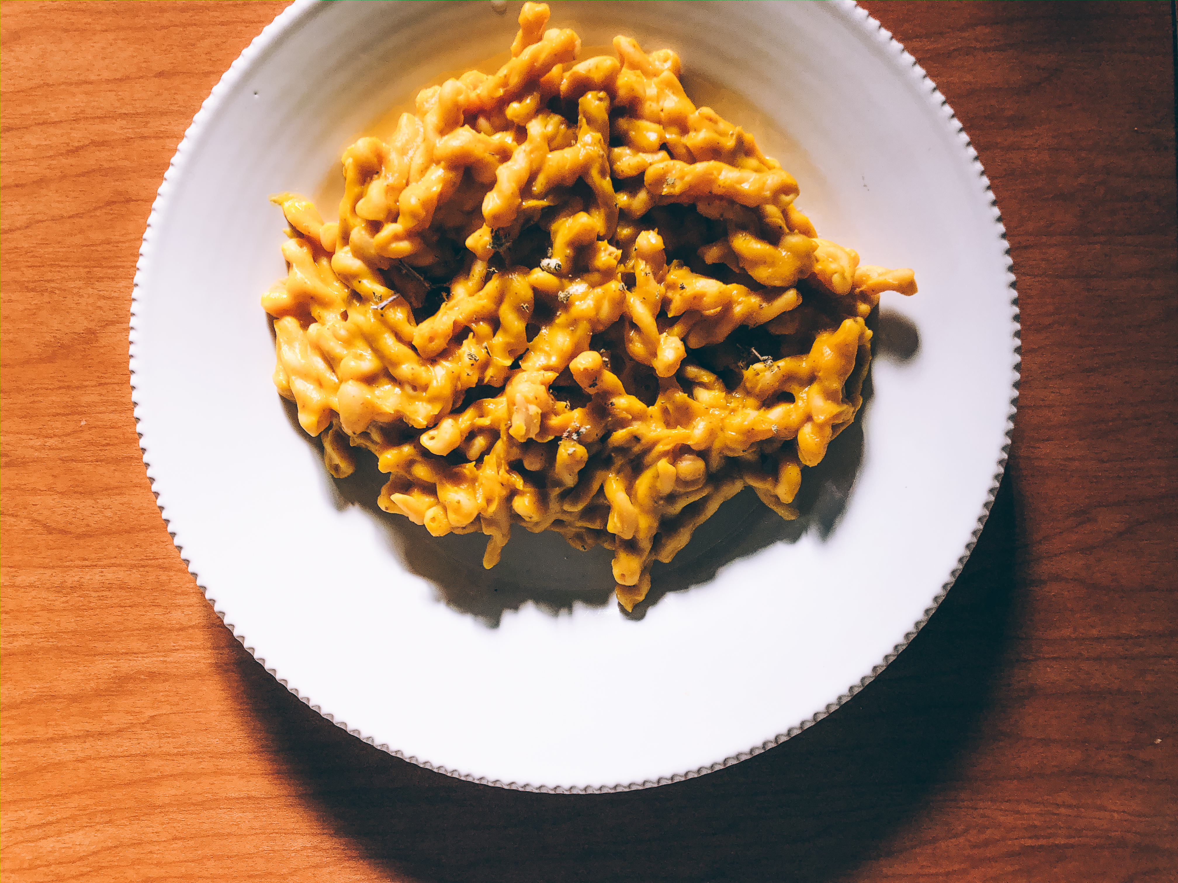 Cook the pasta according to the instructions on the box. Drain it, and then combine it with the sauce. If you’d like some extra greens, tossing in a couple handfuls of spinach or another soft leafy green (such as kale or swiss chard), is ideal at this time.