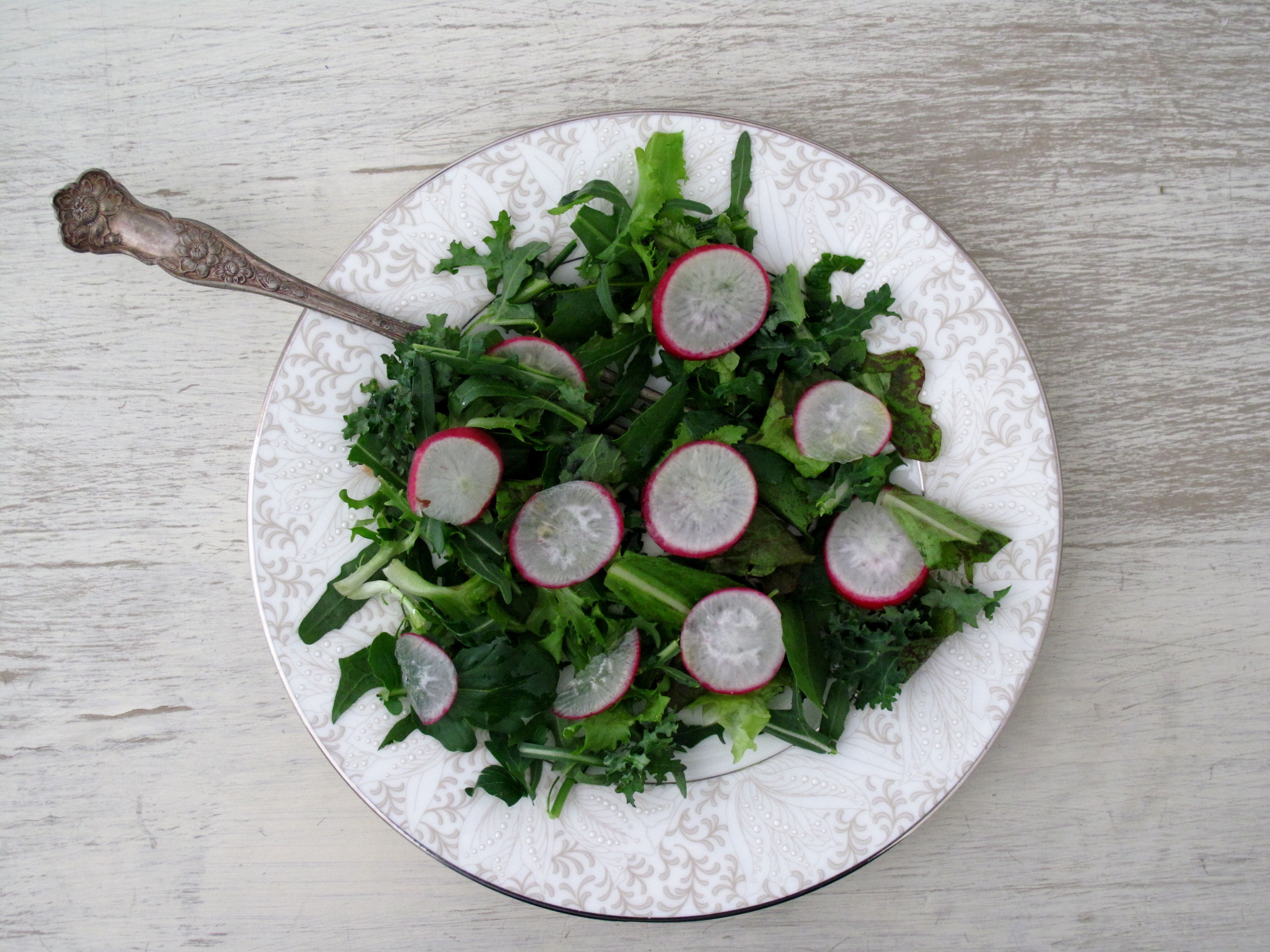 - In a large sauté pan over medium heat, add a splash of the dressing and warm until it starts to develop an aroma. Then add the kale, a pinch of salt, and a little water. Stir and cover to steam sauté for just a couple minutes. Remove from the heat.
