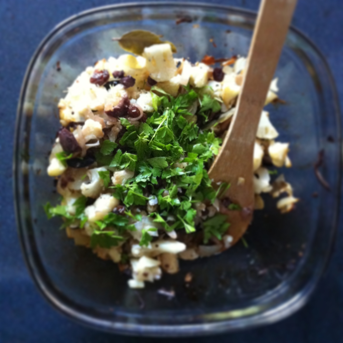 Juice from half an orange 1/2 a head of cauliflower, chopped 1/2 a medium onion, chopped 1/4 cup mixed olives, pitted and diced 1 large or 2 small bay leaves 1/4 cup raisins 1 1/2 Tbs. garlic-infused olive oil Sea salt and ground black pepper, to taste small handful fresh parsley, minced- Preheat the oven to 400 degrees F. In an medium-size oven-proof casserole dish, pour in the orange juice. Toss in the remaining ingredients, except the parsley. Cover with foil and transfer to the oven.
