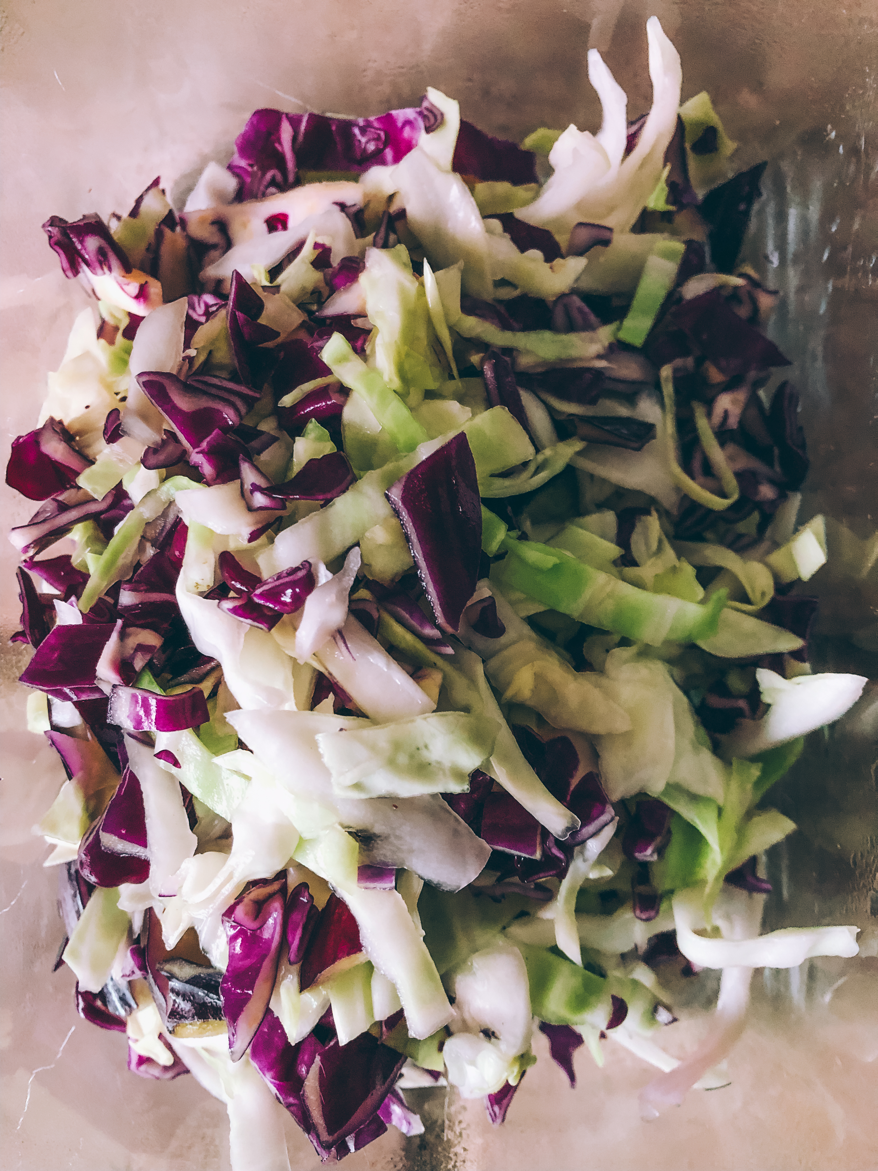 - While the squash is baking, prepare the sliced cabbage. If your digestion is strong, you can thinly slice and dice the cabbage, stir in the salt and lime juice, and allow to sit at room temperature for 20-30 minutes to soften.