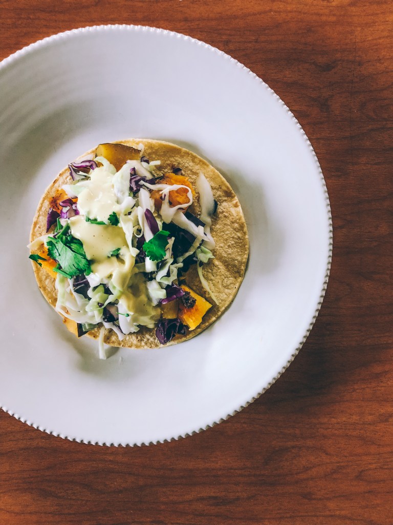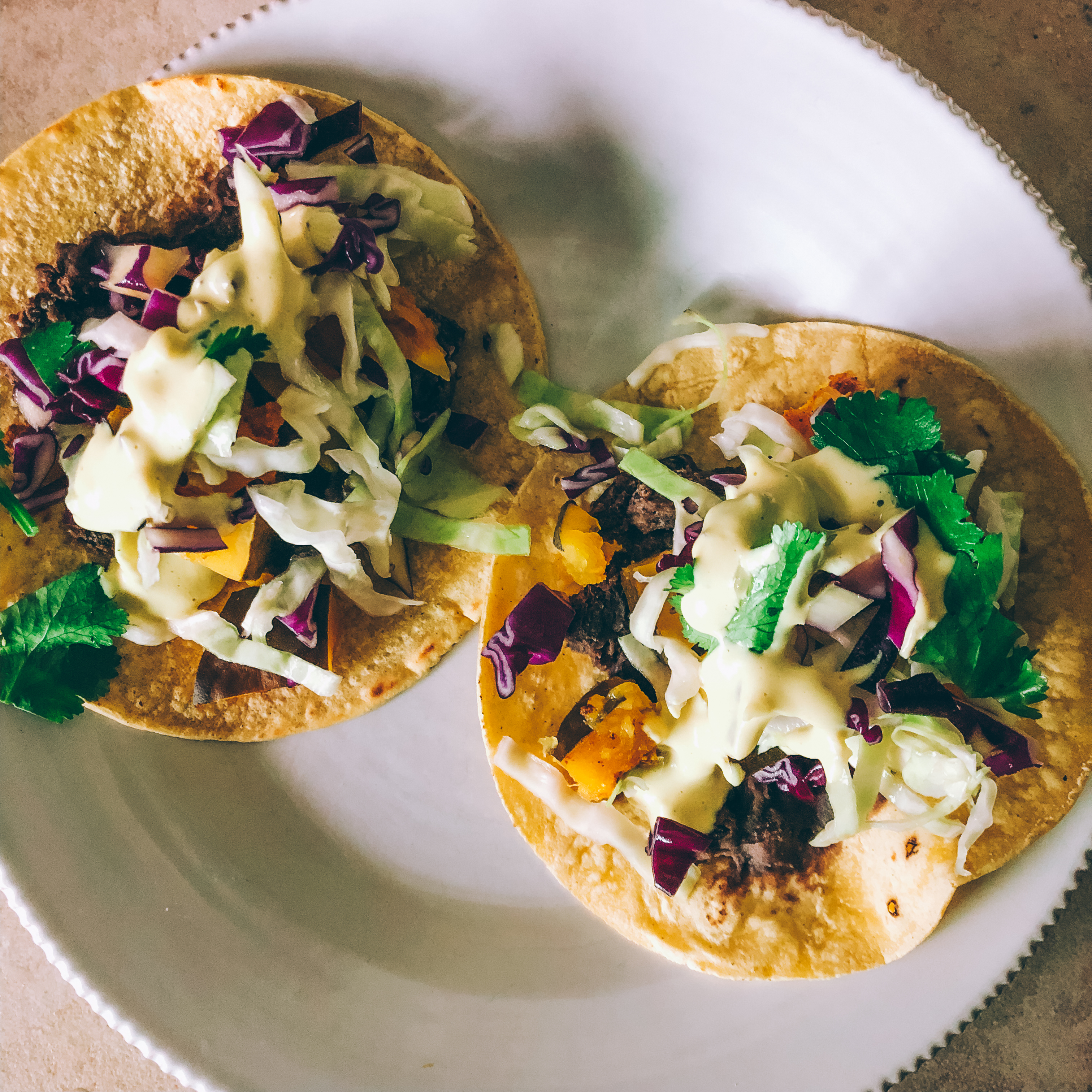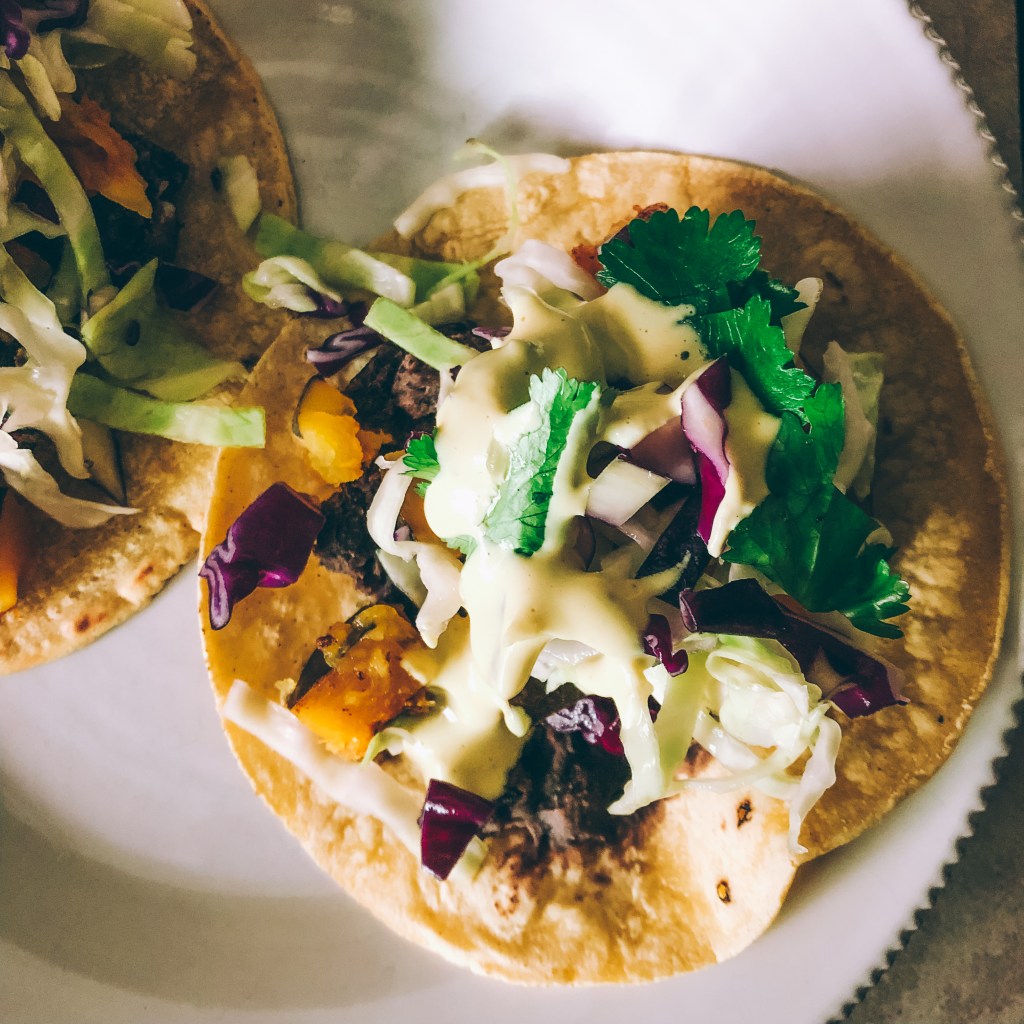 This recipe for creamy black bean tacos with lightly baked and seasoned winter squash, a simple sliced cabbage and creamy sauce to drizzle over the top, is one of those many-years-in-progress, mind and body are all connected recipes. It’s truly delicious for your fall and winter taco nights.