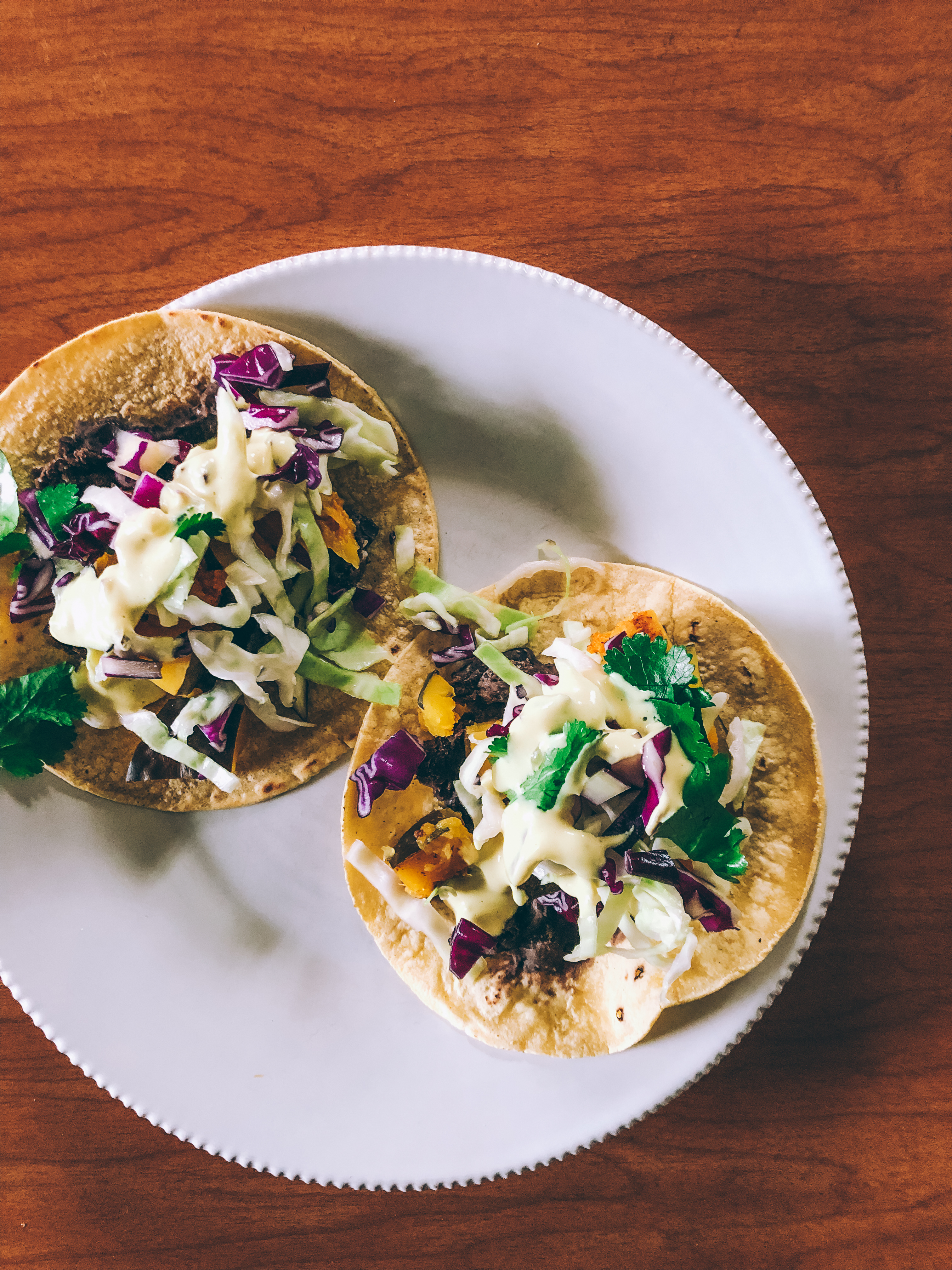 - To serve, spoon the black beans into each taco, followed by sliced squash pieces, cabbage, a pinch of minced cilantro, and then a drizzle of crema. Enjoy!
