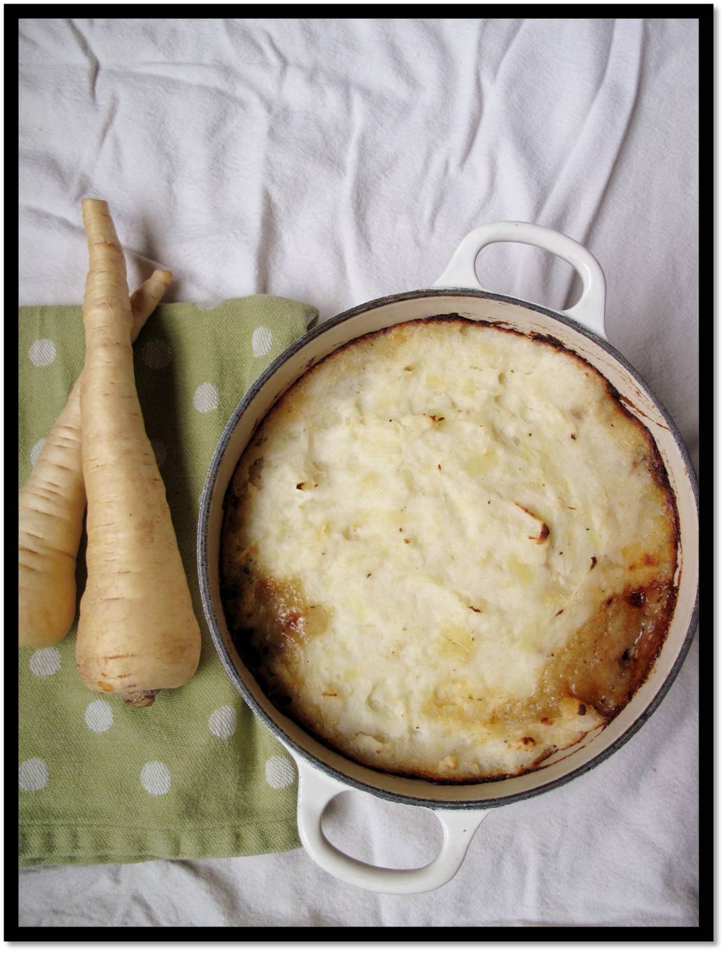 - Transfer the filling to a 2-quart baking dish and top with the mashed potatoes and parsnips. Bake until bubbling and the top is beginning to brown; about 35 minutes.